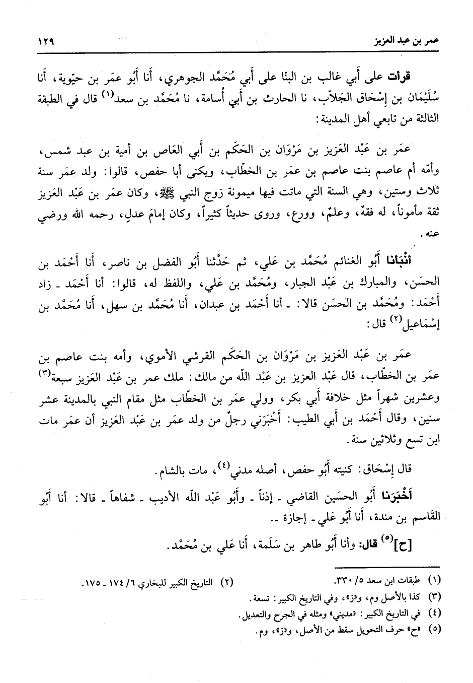 قرأت على أبي غالب بن البنا على أبي محمد الجوهري أنا أبو عمر بن حيوية أنا سليمان بن إسحاق الجلاب نا الحارث بن أبي أسامة نا محمد بن سعد (1) قال في الطبقة الثالثة من تابعي أهل المدينة عمر بن عبد العزيز بن مروان بن الحكم بن أبي العاص بن أمية بن عبد شمس وأمه أم عاصم بنت عاصم بن عمر بن الخطاب ويكنى أبحفص قالوا ولد عمر سنة ثلاث وستين وهي السنة التي ماتت فيها ميمونة زوج النبي (صلى الله عليه وسلم) وكان عمر بن عبد العزيز ثقة مأمونا له فقه وعلم وورع وروى حديثا كثيرا وكان إمام عدل رحمه الله ورضي عنه أنبأنا أبو الغنائم محمبن علي ثم حدثنا أبو الفضل بن ناصر أنا أحمد بن الحسن والمبارك بن عبد الجبار ومحمد بن علي واللفظ له قالوا أنا أحمد زاد أحمد ومحمد بن الحسن قالا أنا أحمد بن عبدان أنا محمد بن سهل أنا محمد بن إسماعيل (2) قال عمر بن عبد العزيز بن مروان بن الحكم القرشي الأموي وأمه بنت عاصم بن عمر بن الخطاب قال عبد العزيز بن عبد الله من مالك ملك عمر بن عبد العزيز سبعة وعشرين شهرا مثل خلافة أبي بكر وولي عمر بن الخطاب مثل مقام النبي بالمدينة عشر سنين وقال أحمد بن أبي الطيب أخبرني رجل من ولد عمر بن عبد العزيز أن عمر مات ابن تسع وثلاثين سنة قال إسحاق كنيته أبو حفص أصله مدني (4) مات بالشام أخبرنا أبو الحسين القاضي إذنا وأبو عبد الله الأديب شفاها قالا أنا أبو القاسم بن مندة أنا أبو علي إجازة ح (5) قال وأنا أبو طاهر بن سلمة أنا علي بن محمد