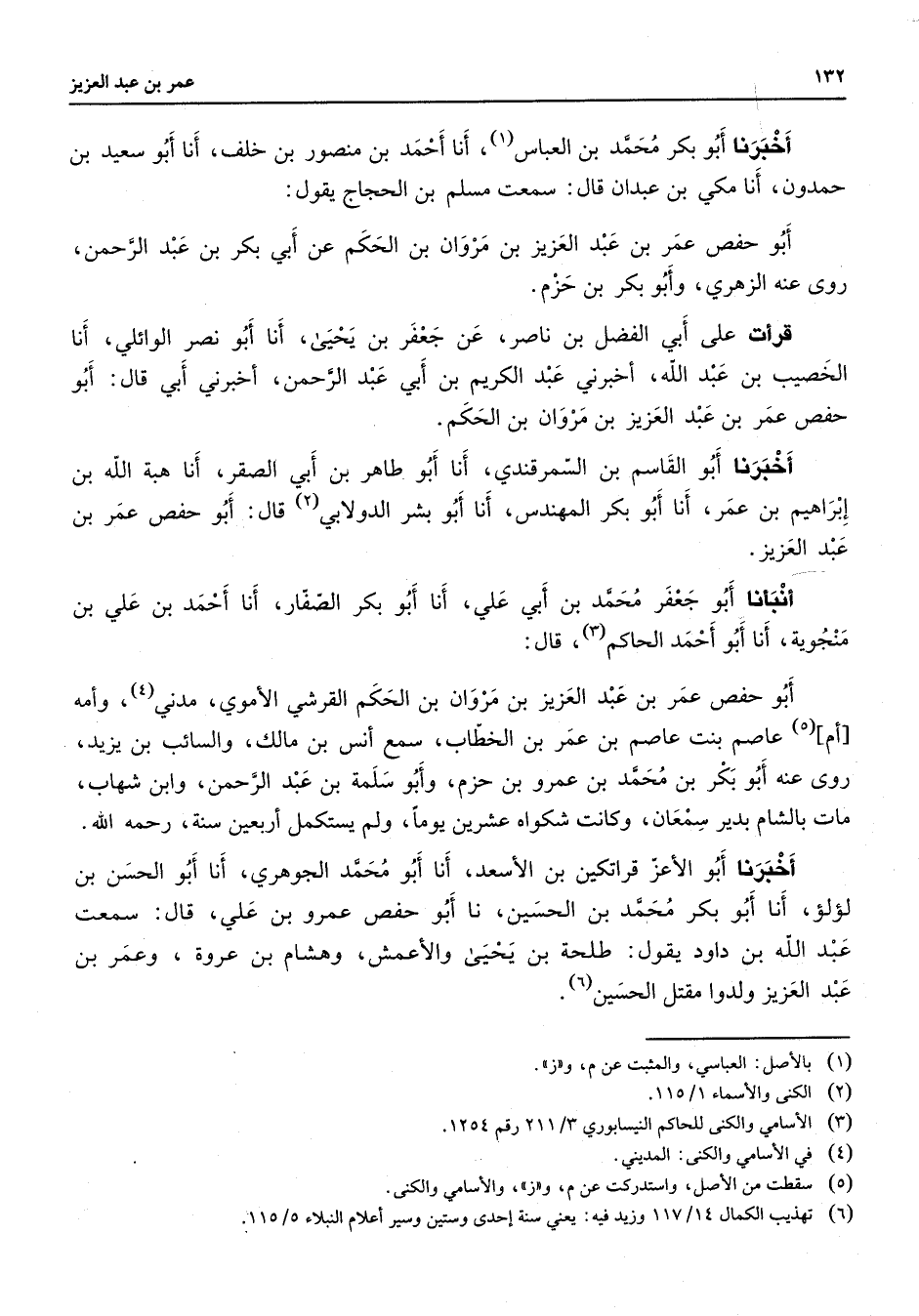 أخبرنا أبو بكر محمد بن العباس (1) أنا أحمد بن منصور بن خلف أنا أبو سعيد بن حمدون أنا مكي بن عبدان قال سمعت مسلم بن الحجاج يقول أبو حفص عمر بن عبد العزيز بن مروان بن الحكم عن أبي بكر بن عبد الرحمن روى عنه الزهري وأبو بكر بن حزم قرأت على أبي الفضل بن ناصر عن جعفر بن يحيى أنا أبو نصر الوائلي أنا الخصيب بن عبد الله أخبرني عبد الكريم بن أبي عبد الرحمن أخبرني أبي قال أبو حفص عمر بن عبد العزيز بن مروان بن الحكم أخبرنا أبو القاسم بن السمرقندي أنا أبو طاهر بن أبي الصقر أنا هبة الله بن إبراهيم بن عمر أنا أبو بكر المهندس أنا أبو بشر الدولابي قال أبو حفص عمر بن عبد العزيز أنبأنا أبو جعفر محمد بن أبي علي أنا أبو بكر الصفار أنا أحمد بن علي بن منجوية أنا أبو أحمد الحاكم (3) قال أبو حفص عمر بن عبد العزيز بن مروان بن الحكم القرشي الأموي مدني (4) وأمه أم (5) عاصم بنت عاصم بن عمبن الخطاب سمع أنس بن مالك والسائب بن يزيد روى عنه أبو بكر بن محمد بن عمر بن حزم وأبو سلمة بن عبد الرحمن وابن شهاب مات بالشام بدير سمعان وكانت شكواه عشرين يوما ولم يستكمل أربعين سنة رحمه الله أخبرنا أبو الأعز قراتكين بن الأسعد أنا أبو محمد الجوهري أنا أبو الحسن بن لؤلؤ أنا أبو بكر محمد بن الحسين نا أبو حفص عمرو بن علي قال سمعت عبد الله بن داود يقول طلحة بن يحيى والأعمش وهشام بن عروة وعمر بن عبد العزيز ولدوا مقتل الحسين (6)