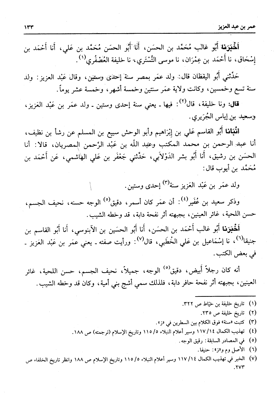 أخبرنا أبو غالب محمد بن الحسن أنا أبو الحسن محمد بن علي أنا أحمد بن إسحاق نا أحمد بن عمران نا موسى التستري نا خليفة العصفري (1) حدثني أبو اليقظان قال ولد عمر بمصر سنة إحدى وستين وقال عبد العزيز ولد سنة تسع وخمسين وكانت ولاية عمر سنتين وخمسة أشهر وخمسة عشر يوما قال ونا خليفة قال (2) فيها يعني سنة إحدى وستين ولد عمر بن عبد العزيز وسعيد بن إياس الجريري أنبأنا أبو القاسم علي بن إبراهيم وأبو الوحش سبيع بن المسلم عن رشأ بن نظيف أنا عبد الرحمن بن محمد المكتب وعبد الله بن عبد الرحمن المصريان قالا أنا الحسن بن رشيق أنا أبو بشر الدولابي حدثني جعفر بن علي الهاشمي عن أحمد بن محمد بن أيوب قال ولد عمر بن عبد العزيز سنة (3) إحدى وستين وذكر سعيد بن عفير (4) أن عمر كان أسمر دقيق (5) الوجه حسنه نحيف الجسم حسن اللحية غائر العينين بجبهته أثر نفحة دابة قد وخطه الشيب أخبرنا أبو غالب أحمد بن الحسن أنا أبو الحسين بن الآبنوسي أنا أبو القاسم بن جنيقا (6) نا إسماعيل بن علي الخطبي قال (7) ورأيت صفته يعني عمر بن عبد العزيز في بعض الكتب أنه كان رجلا أبيض دقيق (5) الوجه جميلا نحيف الجسم حسن اللحية غائر العينين بجبهته أثر نفحة حافر دابة فلذلك سمي أشج بني أمية وكان قد وخطه الشيب