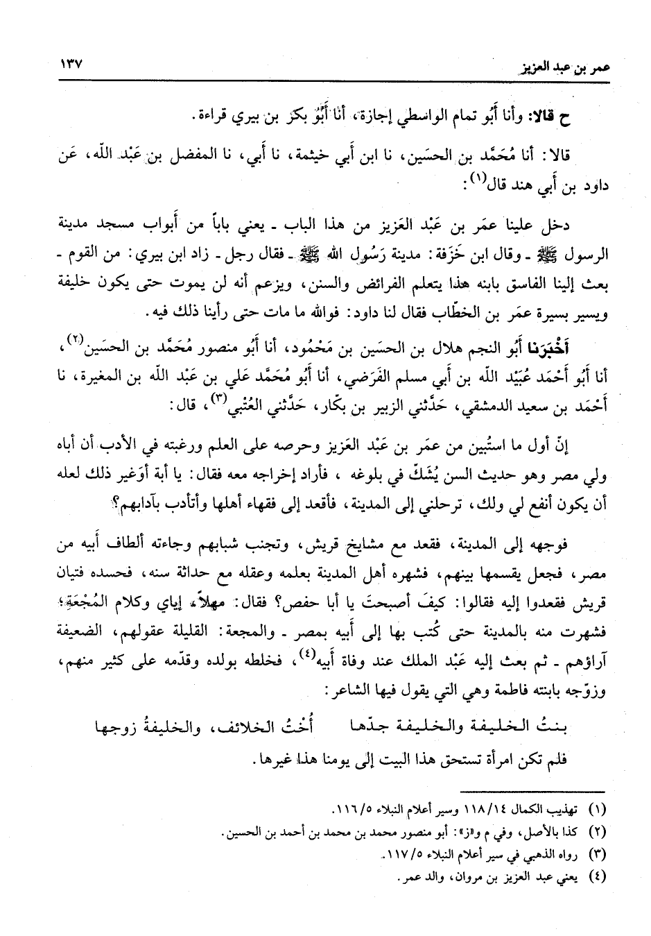 ح قالا وأنا أبو تمام الواسطي إجازة أنا أبو بكر بن بيري قراءة قالا أنا محمد بن الحسين نا ابن أبي خيثمة نا أبي نا المفضل بن عبد الله عن داود بن أبي هند قال (1) دخل علينا عمر بن عبد العزيز من هذا الباب يعني بابا من أبواب مسجد مدينة الرسول (صلى الله عليه وسلم) وقال ابن خزفة مدينة رسول الله (صلى الله عليه وسلم) فقال رجل زاد ابن بيري من القوم بعث إلينا الفاسق بابنه هذا يتعلم الفرائض والسنن ويزعم أنه لن يموت حتى يكون خليفة ويسير بسيرة عمر بن الخطاب فقال لنا داود فوالله ما مات حتى رأينا ذلك أخبرنا أبو النجم هلال بن الحسين بن محمود أنا أبو منصور محمد بن الحسين أنا أبو أحمد عبيد الله بن أبي مسلم الفرضي أنا أبو محمد علي بن عبد الله بن المغيرة نا أحمد بن السعيد الدمشقي حدثني الزبير بن بكار حدثني العتبي (3) قال إن أول ما استبين من عمر بن عبد العزيز وحرصه على العلم ورغبته في الأدب أن أباه ولي مصر وهو حديث السن يشك في بلوغه فأراد إخراجه معه فقال يا أبة أوغير ذلك لعله أن يكون أنفع لي ولك ترحلني إلى المدينة فأقعد إلى فقهاء أهلها وأتأدب بآدابهم فوجهه إلى المدينة فقعد مع مشايخ قريش وتجنب شبابهم وجاءته ألطاف أبيه من مصر فجعل يقسمها بينهم فشهره أهل المدينة بعلمه وعقله مع حداثة سنة فحسده فتيان قريش فقعدوا إليه فقالوا كيف أصبحت يا أبا حفص فقال مهلا إياي وكلام المجعة فشهرت منه بالمدينة حتى كتب بها إلى أبيه بمصر والمجعة القليلة عقولهم الضعيفة آراؤهم ثم بعث إليه عبد الملك عند وفاة أبيه (4) فخلطه بولده وقدمه على كثير منهم وزوجه بابنته فاطمة وهي التي يقول فيها الشاعر * بنت الخليفة والخليفة جدها * أخت الخلائف والخليفة زوجها * فلم تكن امرأة تستحق هذا البيت إلى يومنا هذا غيرها