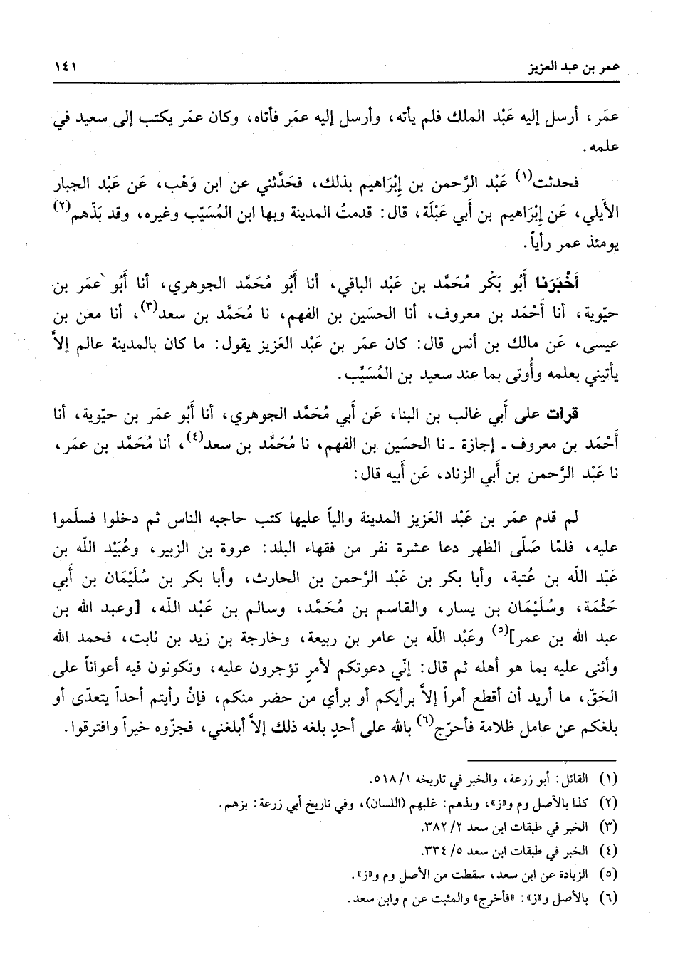 عمر أرسل إليه عبد الملك فلم يأته وأرسل إليه عمر فأتاه وكان عمر يكتب إلى سعيد في علمه فحدثت (1) عبد الرحمن بن إبراهيم بذلك فحدثني عن ابن وهب عن عبد الجبار الأيلي عن إبراهيم بن أبي عبلة قال قدمت المدينة وبها ابن المسيب وغيره وقد بذهم (2) يومئذ عمر رأيا أخبرنا أبو بكر محمد بن عبد الباقي أنا أبو محمد الجوهري أنا أبو عمر بن حيوية أنا أحمد بن معروف أنا الحسين بن الفهم نا محمد بن سعد (3) أنا معن بن عيسى عن مالك بن أنس قال كان عمر بن عبد العزيز يقول ما كان بالمدينة عالم إلا يأتيني بعلمه وأوتى بما عند سعيد بن المسيب قرأت على أبي غالب بن البنا عن أبي محمد الجوهري أنا أبو عمر بن حيوية أنا أحمد بن معروف إجازة نا الحسين بن الفهم نا محمد بن سعد أنا محمد بن عمر نا عبد الرحمن بن أبي الزناد عن أبيه قال لم قدم عمر بن عبد العزيز المدينة واليا عليها كتب حاجبه الناس ثم دخلوا فسلموا عليه فلما صلى الظهر دعا عشرة نفر من فقهاء البلد عروة بن الزبير وعبيد الله بن عبد الله بن عتبة وأبا بكر بن عبد الرحمن بن الحارث وأبا بكر بن سليمان بن أبي حثمة وسليمان بن يسار والقاسم بن محمد وسالم بن عبد الله وعبد الله بن عبد الله بن عمر (5) وعبد الله بن عامر بن ربيعة وخارجة بن زيد بن ثابت فحمد الله وأثنى عليه بما هو أهله ثم قال إني دعوتكم لأمر تؤجرون عليه وتكونون فيه أعوانا على الحق ما أريد أن أقطع أمرا إلا برأيكم أو برأي من حضر منكم فإن رأيتم أحدا يتعدى أو بلغكم عن عامل ظلامة فأحرج (6) بالله على أحد بلغه ذلك إلا أبلغني فجزوه خيرا وافترقوا