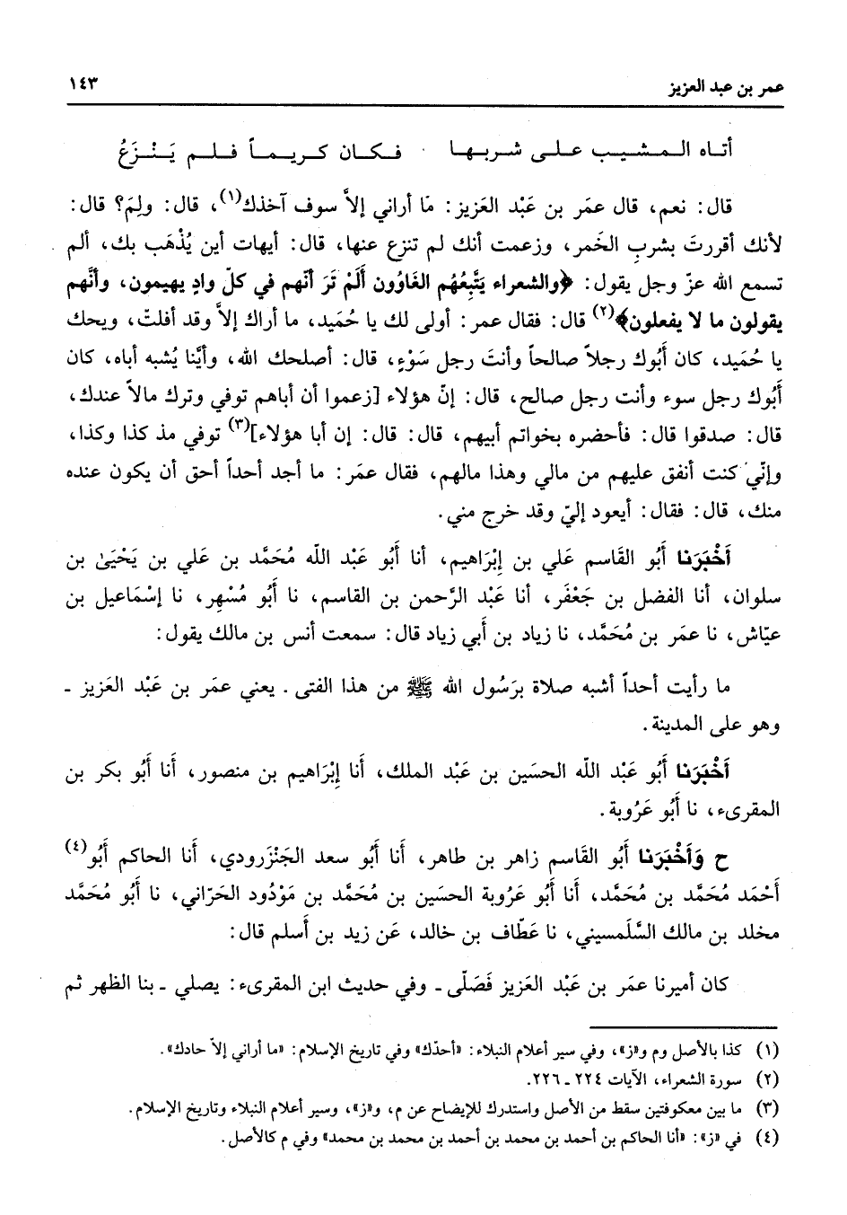 أتاه المشيب على شربها * فكان كريما فلم ينزع * قال نعم قال عمر بن عبد العزيز ما أراني إلا سوف آخذك (1) قال ولم قال لأنك أقررت بشرب الخمر وزعمت أنك لم تنزع عنها قال أيهات أين يذهب بك ألم تسمع الله عز وجل يقول " والشعراء يتبعهم الغاوون ألتر أنهم في كل واد يهيمون وأنهم يقولون ما لا يفعلون " (2) قال فقال عمر أولى لك يا حميد ما أراك إلا وقد أفلت ويحك يا حميد كان أبوك رجلا صالحا وأنت رجل سوء قال أصلحك الله وأينا يشبه أباه كان أبوك رجل سوء وأنت رجل صالح قال إن هؤلاء زعموا أن أباهم توفي وترك مالا عندك قال صدقوا قال فأحضره بخواتم أبيهم قال قال إن أبا هؤلاء (3) توفي مذ كذا وكذا وإني كنت أنفق عليهم من مالي وهذا مالهم فقال عمر ما أجد أحدا أحق أن يكون عنده منك قال فقال أيعود إلي وقد خرج مني أخبرنا أبو القاسم علي بن إبراهيم أنا أبو عبد الله محمد بن علي بن يحيى بن سلوان أنا الفضل بن جعفر أنا عبد الرحمن بن القاسم نا أبو مسهر نا إسماعيل بن عياش نا عمر بمحمد نا زياد بن أبي زياد قال سمعت أنس بن مالك يقول ما رأيت أحدا أشبه صلاة برسول الله (صلى الله عليه وسلم) من هذا الفتى يعني عمر بن عبد العزيز وهو على المدينة أخبرنا أبو عبد الله الحسين بن عبد الملك أنا إبراهيم بن منصور أنا أبو بكر بن المقرئ نا أبو عروبة ح وأخبرنا أبو القاسم زاهر بن طاهر أنا أبو سعد الجنزرودي أنا الحاكم أبو (4) أحمد محمد بن محمد أنا أبو عروبة الحسين بن محمد بن مودود الحراني نا أبو محمد مخلد بن مالك السلمسيني نا عطاف بن خالد عن زيد بن أسلم قال كان أميرنا عمر بن عبد العزيز فصلى وفي حديث ابن المقرئ يصلي بنا الظهر ثم