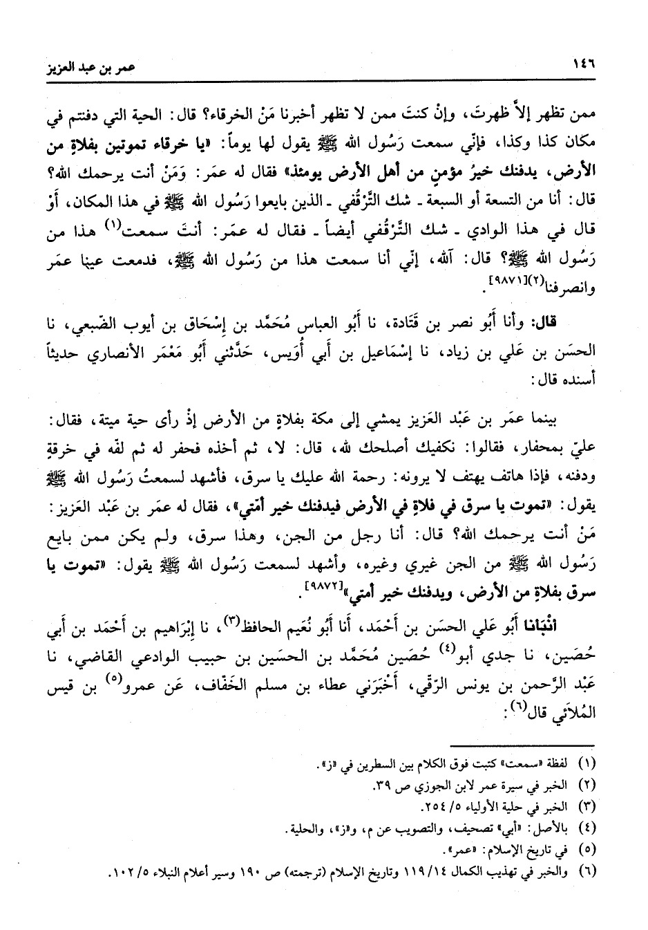 ممن تظهر إلا ظهرت وإن كنت ممن لا تظهر أخبرنا من الخرقاء قال الحية التي دفنتم في مكان كذا وكذا فإني سمعت رسول الله (صلى الله عليه وسلم) يقول لها يوما يا خرقاء تموتين بفلاة من الأرض يدفنك خير مؤمن من أهل الأرض يومئذ فقال له عمر ومن أنت يرحمك الله قال أنا من التسعة أو السبعة شك الترقفي الذين بايعوا رسول الله (صلى الله عليه وسلم) في هذا المكان أو قال في هذا الوادي شك الترقفي أيضا فقال له عمر أنت سمعت (1) هذا من رسول الله (صلى الله عليه وسلم) قال آلله إني أنا سمعت هذا من رسول الله (صلى الله عليه وسلم) فدمعت عينا عمر وانصرفنا (2) قال وأنا أبو نصر بن قتادة نا أبو العباس محمد بن إسحاق بن أيوب الضبعي نا الحسن بن علي بن زياد نا إسماعيل بن أبي أويس حدثني أبو معمر الأنصاري حديثا أسنده قال بينما عمر بن عبد العزيز يمشي إلى مكة بفلاة من الأرض إذ رأى حية ميتة فقال على بمحفار فقالوا نكفيك أصلحك لله قال لا ثم أخذه فحفر له ثم لفه في خرقة ودفنه فإذا هاتف يهتف لا يرونه رحمة الله عليك يا سرق فأشهد لسمعت رسول الله (صلى الله عليه وسلم) يقول تموت يا سرق في فلاة في الأرض فيدفنك خير أمتي فقال له عمر بن عبد العزيز من أنت يرحمك الله قال أنا رجل من الجن وهذا سرق ولم يكن ممن بايع رسول الله (صلى الله عليه وسلم) من الجن غيري وغيره وأشهد لسمعت رسول الله (صلى الله عليه وسلم) يقول تموت يا سرق بفلاة من الأرض ويدفنك خير أمتي أنبأنا أبو علي الحسن بن أحمد أنا أبو نعيم الحافظ (3) نا إبراهيم بن أحمد بن أبي حصين نا جدي أبو (4) حصين محمد بن الحسين بن حبيب الوادعي القاضي نا عبد الرحمن بن يونس الرقي أخبرني عطاء بن مسلم الخفاف عن عمرو (5) بن قيس الملائي قال (6)