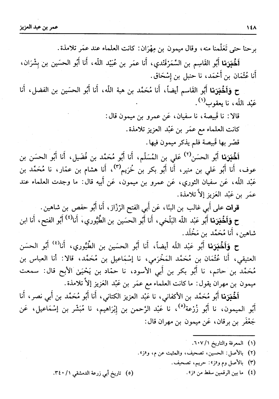 برحنا حتى تعلمنا منه وقال ميمون بن مهران كانت العلماء عند عمر تلامذة أخبرنا أبو القاسم بن السمرقندي أنا عمر بن عبيد الله أنا أبو الحسين بن بشران أنا عثمان بن أحمد نا حنبل بن إسحاق ح وأخبرنا أبو القاسم أيضا أنا محمد بن هبة الله أنا أبو الحسين بن الفضل أنا عبد الله نا يعقوب (1) قالا نا قبيصة نا سفيان عن عمرو بن ميمون قال كانت العلماء مع عمر بن عبد العزيز تلامذة قصر بها قبيصة فلم يذكر ميمون فيها أخبرنا أبو الحسن (2) علي بن المسلم أنا أبو محمد بن فضيل أنا أبو الحسن بن عوف أنا أبو علي بن منير أنا أبو بكر بن خريم (3) أنا هشام بن عمار نا محمد بن عبد الله عن سفيان الثوري عن عمرو بن ميمون عن أبيه قال ما وجدت العلماء عند عمر بن عبد العزيز إلا تلامذة قرأت على أبي غالب بن البنا عن أبي الفتح الرزاز أنا أبو حفص بن شاهين ح وأخبرنا أبو عبد الله البلخي أنا أبو الحسين بن الطيوري أنا أبو الفتح أنا ابن شاهين أنا محمد بن مخلد ح وأخبرنا أبو عبد الله أيضا أنا أبو الحسين بن الطيوري أنا أبو الحسن العتيقي أنا عثمان بن محمد المخرمي نا إسماعيل بن محمد قالا أنا العباس بن محمد بن حاتم نا أبو بكر بن أبي الأسود نا حماد بن يحيى الأبح قال سمعت ميمون بن مهران يقول ما كانت العلماء مع عمر بن عبد العزيز إلا تلامذة أخبرنا أبو محمد بن الأكفاني نا عبد العزيز الكتاني أنا أبو محمد بن أبي نصر أنا أبو الميمون نا أبو زرعة (5) نا عبد الرحمن بن إبراهيم نا مبشر بن إسماعيل عن جعفر بن برقان عن ميمون بن مهران قال