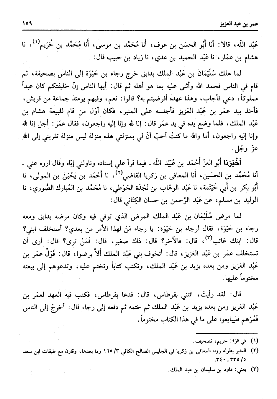عبد الله قالا أنا أبو الحسن بن عوف أنا محمد بن موسى أنا محمد بن خريم (1) نا هشام بن عمار نا عبد الحميد بن عدي نا زياد بن حبيب قال لما هلك سليمان بن عبد الملك بدابق خرج رجاء بن حيوة إلى الناس بصحيفة ثم قام في الناس فحمد الله وأثنى عليه بما هو أهله ثم قال أيها الناس إن خليفتكم كان عبدا مملوكا دعي فأجاب وهذا عهده أفرضيتم به قالوا نعم وفيهم يومئذ جماعة من قريش فأخذ بيد عمربن عبد العزيز فأجلسه على المنبر فكان أول من قام للبيعة هشام بن عبد الملك فلما وضع يده في يد عمر قال إنا لله وإنا إليه راجعون فقال عمر أجل إنا لله وإنا إليه راجعون أما والله ما كنت أحب أن لي بمنزلتي هذه منزلة ليس منزلة تقربني إلى الله عز وجل أخبرنا أبو العز أحمد بن عبيد الله فيما قرأ علي إسناده وناولني إياه وقال اروه عني أنا محمد بن الحسين أنا المعافى بن زكريا القاضي (2) نا أحمد بن يحيى بن المولى نا أبو بكر بن أبي خيثمة نا عبد الوهاب بن نجدة الحوطي نا محمد بن المبارك الصوري نا الوليد بن مسلم عن عبد الرحمن بن حسان الكناني قال لما مرض سليمان بن عبد الملك المرض الذي توفي فيه وكان مرضه بدابق ومعه رجاء بن حيوة فقال لرجاء بن حيوة يا رجاء من لهذا الأمر من بعدي أستخلف ابني قال ابنك غائب (3) قال فالآخر قال ذاك صغير قال فمن ترى قال أرى أن تستخلف عمربن عبد العزيز قال أتخوف بني عبد الملك ألا يرضوا قال فول عمر بن عبد العزيز ومن بعده يزيد بن عبد الملك وتكتب كتابا وتختم عليه وتدعوهم إلى بيعته مختوما عليها قال لقد رأيت ائتني بقرطاس قال فدعا بقرطاس فكتب فيه العهد لعمر بن عبد العزيز ومن بعده يزيد بن عبد الملك ثم ختمه ثم دفعه إلى رجاء قال أخرج إلى الناس فمرهم فليبايعوا على ما في هذا الكتاب مختوما