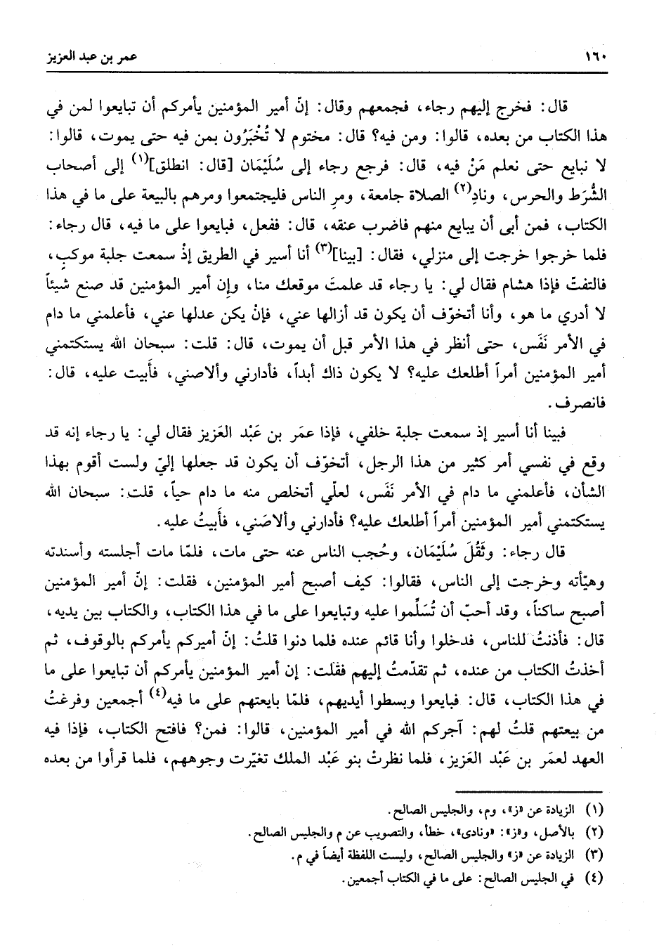 قال فخرج إليهم رجاء فجمعهم وقال إن أمير المؤمنين يأمركم أن تبايعوا لمن في هذا الكتاب من بعده قالوا ومن فيه قال مختوم لا تخبرون بمن فيه حتى يموت قالوا لا نبايع حتى نعلم من فيه قال فرجع رجاء إلى سليمان قال انطلق (1) إلى أصحاب الشرط والحرس وناد (2) الصلاة جامعة ومر الناس فليجتمعوا ومرهم بالبيعة على ما في هذا الكتاب فمن أبى أن يبايع منهم فاضرب عنقه قال ففعل فبايعوا على ما فيه قال رجاء فلما خرجوا خرجت إلى منزلي فقال بينا (3) أنا أسير في الطريق إذ سمعت جلبة موكب فالتفت فإذا هشام فقال لي يا رجاء قد علمت موقعك منا وإن أمير المؤمنين قد صنع شيئا إ لا أدري ما هو وأنا أتخوف أن يكون قد أزالها عني فإن يكن عدلها عني فأعلمني ما دام في الأمر نفس حتى أنظر في هذا الأمر قبل أن يموت قال قلت سبحان الله يستكتمني أمير المؤمنين أمرا أطلعك عليه لا يكون ذاك أبدا فأدارني وألاصني فأبيت عليه قال فانصرف فبينا أنا أسير إذ سمعت جلبة خلفي فإذا عمر بن عبد العزيز فقال لي يا رجاء إنه قد وقع في نفسي أمر كثير من هذا الرجل أتخوف أن يكون قد جعلها إلي ولست أقوم بهذا الشأن فأعلمني ما دام في الأمر نفس لعلي أتخلص منه ما دام حيا قلت سبحان الله يستكتمني أمير المؤمنين أمرا أطلعك عليه فأدارني وألاصني فأبيت عليه قال رجاء وثقل سليمان وحجب الناس عنه حتى مات فلما مات أجلسته وأسندته وهيأته وخرجت إلى الناس فقالوا كيف أصبح أمير المؤمنين فقلت إن أمير المؤمنين أصبح ساكنا وقد أحب أن تسلموا عليه وتبايعوا على ما في هذا الكتاب والكتاب بين يديه قال فأذنت للناس فدخلوا وأنا قائم عنده فلما دنوا قلت إن أميركم يأمركم بالوقوف ثم أخذت الكتاب من عنده ثم تقدم إليهم فقلت إن أمير المؤمنين يأمركم أن تبايعوا على ما في هذا الكتاب قال فبايعوا وبسطوا أيديهم فلما بايعتهم على ما فيه (4) أجمعين وفرغت من بيعتهم قلت لهم آجركم الله في أمير المؤمنين قالوا فمن فافتح الكتاب فإذا فيه العهد لعمر بن عبد العزيز فلما نظرت بنو عبد الملك تغيرت وجوههم فلما قرأوا من بعده