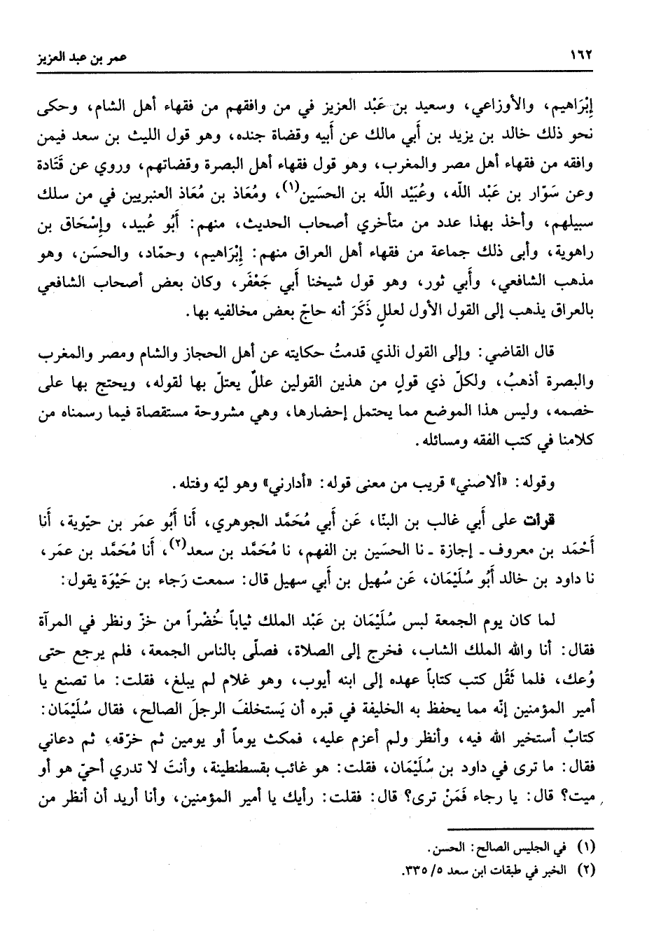 إبراهيم والأوزاعي وسعيد بن عبد العزيز في من وافقهم من فقهاء أهل الشام وحكى نحو ذلك خالد بن يزيد بن أبي مالك عن أبيه وقضاة جنده وهو قول الليث بن سعفيمن وافقه من فقهاء أهل مصر والمغرب وهو قول فقهاء أهل البصرة وقضاتهم وروي عقتادة وعن سوار بن عبد الله وعبيد الله بن الحسين (1) ومعاذ بن معاذ العنبريين في من سلك سبيلهم وأخذ بهذا عدد من متأخري أصحاب الحديث منهم أبو عبيد وإسحاق بن راهوية وأبى ذلك جماعة من فقهاء أهل العراق منهم إبراهيم وحماد والحسن وهو مذهب الشافعي وأبي ثور وهو قول شيخنا أبي جعفر وكان بعض أصحاب الشافعي بالعراق يذهب إلى القول الأول لعلل ذلك أنه حاج بعض مخالفيه بها قال القاضي وإلى القول الذي قدمت حكايته عن أهل الحجاز والشام ومصر والمغرب والبصرة أذهب ولكل ذي قول من هذين القولين علل يعتل بها لقوله ويحتج بها على خصمه وليس هذا الموضع مما يحتمل إحضارها وهي مشروحة مستقصاة فيما رسمناه من كلامنا في كتب الفقه ومسائله وقوله ألاصني قريب من معنى قوله أدارني وهو ليه وفتله قرات على أبي غالب بن البنا عن أبي محمد الجوهري أنا أبو عمر بن حيوية أنا أحمد بن معروف إجازة نا الحسين بن الفهم نا محمد بن سعد (2) أنا محمد بن عمر نا داود بن خالد أبو سليمان عن سهيل بن أبي سهيل قال سمعت رجاء بن حيوة يقول لما كان يوم الجمعة لبس سليمان بن عبد الملك ثيابا خضرا من خز ونظر في المرآة فقال أنا والله الملك الشاب فخرج إلى الصلاة فصلى بالناس الجمعة فلم يرجع حتى وعك فلما ثقل كتب كتابا عهده إلى ابنه أيوب وهو غلام لم يبلغ فقلت ما تصنع يا أمير المؤمنين إنه مما يحفظ به الخليفة في قبره أن يستخلف الرجل الصالح فقال سليمان كتاب أستخير الله فيه وأنظر ولم أعزم عليه فمكث يوما أو يومين ثم خرقه ثم دعاني فقال ما ترى في داود بن سليمان فقلت هو غائب بقسطنطينة وأنت لا تدري أحي هو أو ميت قال يا رجاء فمن ترى قال فقلت رأيك يا أمير المؤمنين وأنا أريد أأنظر من