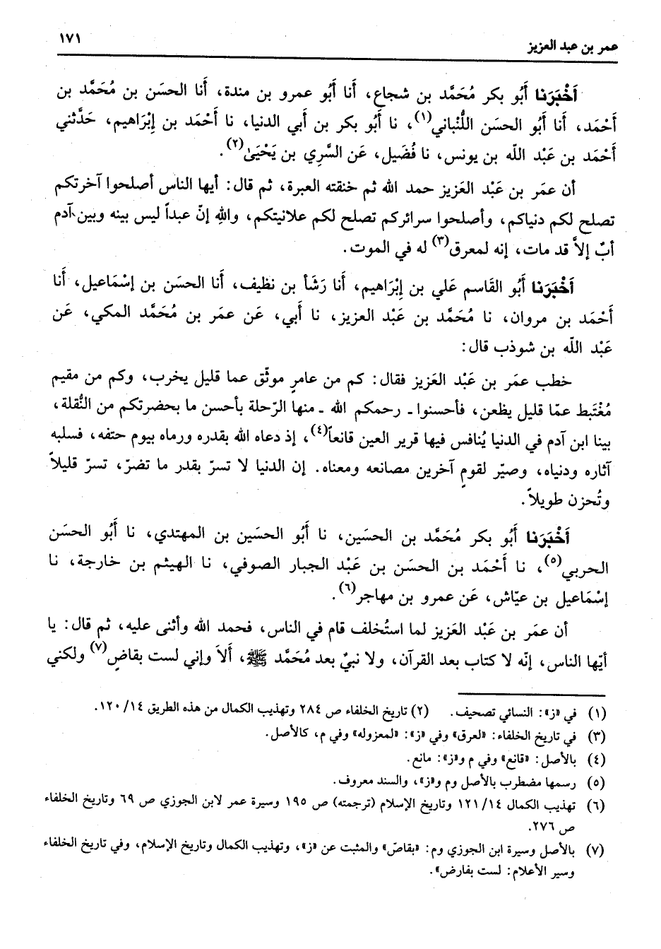 (5) رسمها مضطرب بالأصل وم و (ز) والسند معروف (6) تهذيب الكمال 14 / 121 وتاريخ الإسلام (ترجمته) ص 195 وسيرة عمر لابن الجوزي ص 69 وتاريخ الخلفاء ص 276
