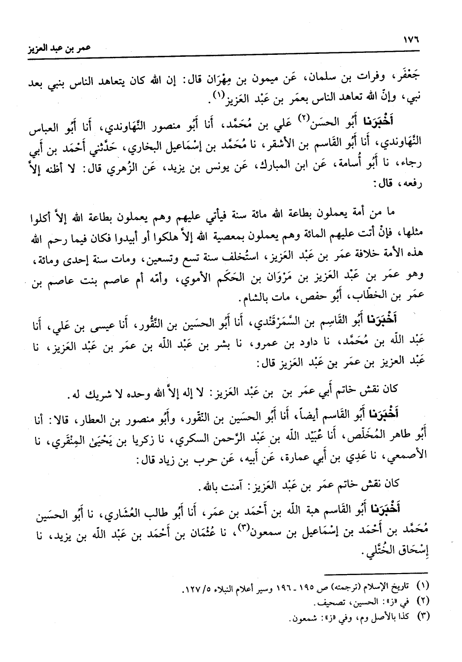جعفر وفرات بن سلمان عن ميمون بن مهران قال إن الله كان يتعاهد الناس بنبي بعد نبي وإن الله تعاهد الناس بعمر بن عبد العزيز (1) أخبرنا أبو الحسن (2) علي بن محمد أنا أبو منصور النهاوندي أنا أبو العباس النهاوندي أنا أبو القاسم بن الأشقر نا محمد بن إسماعيل البخاري حدثني أحمد بن أبي رجاء نا أبو أسامة عن ابن المبارك عن يونس بن يزيد عن الزهري قال لا أظنه إلا رفعه قال ما من أمة يعملون بطاعة الله مائة سنة فيأتي عليهم وهم يعملون بطاعة الله إلا أكلوا مثلها فإن أتت عليهم المائة وهم يعملون بمعصية الله إلا هلكوا أو أبيدوا فكان فيما رحم الله هذه الأمة خلافة عمر بن عبد العزيز استخلف سنة تسع وتسعين ومات سنة إحدى ومائة وهو عمر بن عبد العزيز بن مروان بن الحكم الأموي وأمه أم عاصم بنت عاصم بن عمر بن الخطاب أبو حفص مات بالشام أخبرنا أبو القاسم بن السمرقندي أنا أبو الحسين بن النقور أنا عيسى بن علي أنا عبد الله بن محمد نا داود بن عمرو نا بشر بن عبد الله بن عمر بن عبد العزيز نا عبد العزيز بن عمر بن عبد العزيز قال كان نقش خاتم أبي عمر بن بن عبد العزيز لا إله إلا الله وحده لا شريك له أخبرنا أبو القاسم أيضا أنا أبو الحسين بن النقور وأبو منصور بن العطار قالا أنا أبو طاهر المخلص أنا عبيد الله بن عبد الرحمن السكري نا زكريا بن يحيى المنقري نا الأصمعي نا عدي بن أبي عمارة عن أبيه عن حرب بن زياد قال كان نقش خاتم عمر بن عبد العزيز آمنت بالله أخبرنا أبو القاسم هبة الله بن أحمد بن عمر أنا أبو طالب العشاري نا أبو الحسين محمد بن أحمد بن إسماعيل بن سمعون (3) نا عثمان بن أحمد بن عبد الله بن يزيد نا إسحاق الختلي