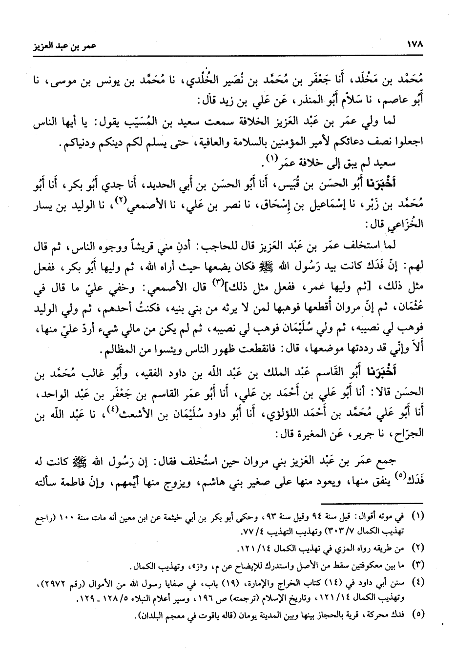 محمد بن مخلد أنا جعفر بن محمد بن نصير الخلدنا محمد بن يونس بن موسى نا أبو عاصم نا سلام أبو المنذر عن علي بن زيد قال لما ولي عمر بن عبد العزيز الخلافة سمعت سعيد بن المسيب يقول يا أيها الناس اجعلوا نصف دعائكم لأمير المؤمنين بالسلامة والعافية حتى يسلم لكم دينكم ودنياكم سعيد لم يبق إلى خلافة عمر (1) أخبرنا أبو الحسن بن قبيس أنا أبو الحسن بن أبي الحديد أنا جدي أبو بكر أنا أبو محمد بن زبر نا إسماعيل بن إسحاق نا نصر بن علي نا الأصمعي (2) نا الوليد بن يسار الخزاعي قال لما استخلف عمر بن عبد العزيز قال للحاجب أدن مني قريشا ووجوه الناس ثم قال لهم إن فدك كانت بيد رسول الله (صلى الله عليه وسلم) فكان يضعها حيث أراه الله ثم وليها أبو بكر ففعل مثل ذلك ثم وليها عمر ففعل مثل ذلك (3) قال الأصمعي وخفي علي ما قال في عثمان ثم إن مروان أقطعها فوهبها لمن لا يرثه من بني بنيه فكنت أحدهم ثم ولي الوليد فوهب لي نصيبه ثم ولي سليمان فوهب لي نصيبه ثم لم يكن من مالي شئ أرد علي منها ألا وإني قدرددتها موضعها قال فانقطعت ظهور الناس ويئسوا من المظالم أخبرنا أبو القاسم عبد الملك بن عبد الله بن داود الفقيه وأبو غالب محمد بن الحسن قالا أنا أبو علي بن أحمد بن علي أنا أبو عمر القاسم بن جعفر بن عبد الواحد أنا أبو علي محمد بن أحمد اللؤلؤي أنا أبو داود سليمان بن الأشعث (4) نا عبد الله بن الجراح نا جرير عن المغيرة قال جمع عمر بن عبد العزيز بني مروان حين استخلف فقال إن رسول الله (صلى الله عليه وسلم) كانت له فدك (5) ينفق منها ويعود منها على صغير بني هاشم ويزوج منها أيمهم وإن فاطمة سألته