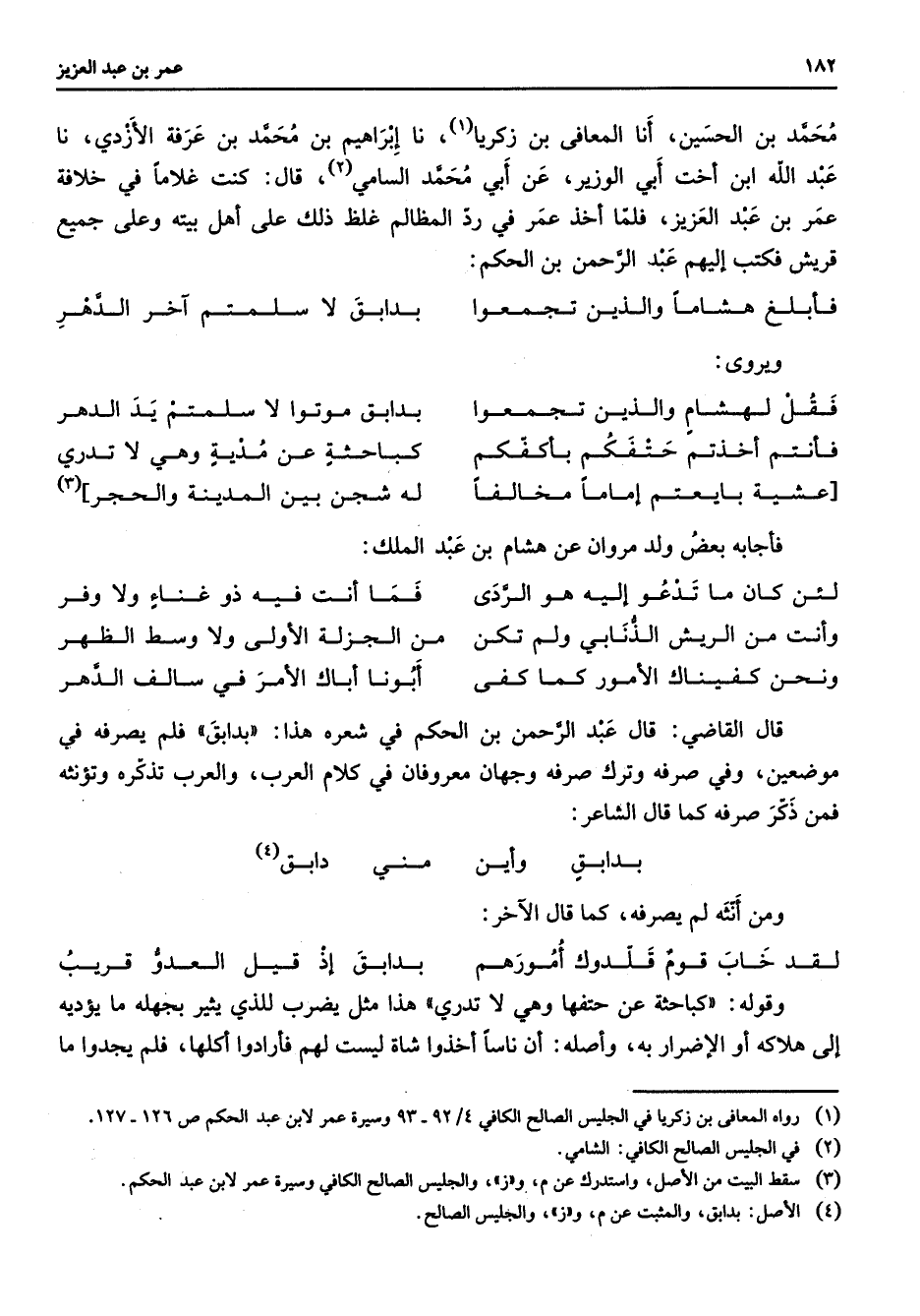 (1) رواه المعافي بن زكريا في الجليس الصالح الكافي 4 / 92 - 93 وسيرة عمر لا بن عبد الحكم ص 126 - 127