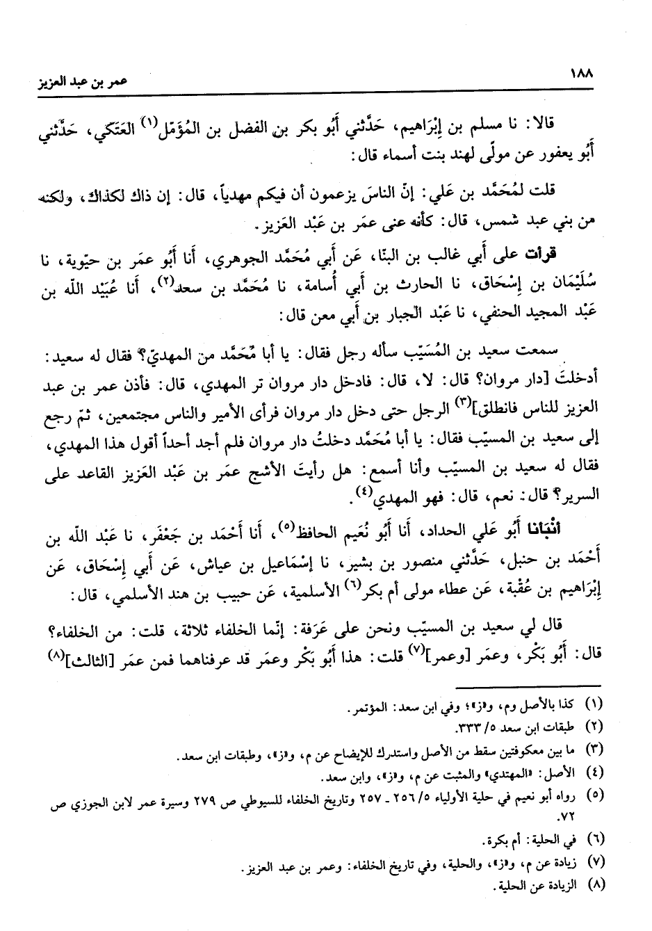 قالا نا مسلم بن إبراهيم حدثني أبو بكر بن الفضل بن المؤمل (1) العتكي حدثني أبو يعفور عن مولى لهند بنت أسماء قال قلت لمحمد بن علي: إن الناس يزعمون أن فيكم مهديا قال إن ذاك لكذاك ولكنه من بني عبد شمس قال كأنه عنى عمر بن عبد العزيز قرأت على أبي غالب بن البنا عن أبي محمد الجوهري أنا أبو عمر بن حيوية نا سليمان بن إسحاق نا الحارث بن أبي أسامة نا محمد بن سعد (2) أنا عبيد الله بن عبد المجيد الحنفي نا عبد الجبار بن أبي معن قال سمعت سعيد بن المسيب سأله رجل فقال يا أبا محمد من المهدي فقال له سعيد أدخلت دار مروان قال لا قال فادخل دار مروان تر المهدي قال فأذن عمر بن عبد العزيز للناس فانطلق (3) الرجل حتى دخل دار مروان فرأى الأمير والناس مجتمعين ثم رجع إلى سعيد بن المسيب فقال يا أبا محمد دخلت دار مروان فلم أجد أحدا أقول هذا المهدي فقال له سعيد بن المسيب وأنا أسمع هل رأيت الأشج عمر بن عبد العزيز القاعد على السرير قال نعم قال فهو المهدي (4) أنبأنا أبو علي الحداد أنا أبو نعيم الحافظ (5) أنا أحمد بن جعفر نا عبد الله بن أحمد بن حنبل حدثني منصور بن بشير نا إسماعيل بن عياش عن أبي إسحاق عن إبراهيم بن عقبة عن عطاء مولى أم بكر (6) الأسلمية عن حبيب بن هند الأسلمي قال قال لي سعيد بن المسيب ونحن على عرفة إنما الخلفاء ثلاثة قلت من: الخلفاء قال أبو بكر وعمر وعمر (7) قلت هذا أبو بكر وعمر قد عرفناهما فمن عمر الثالث (8)
