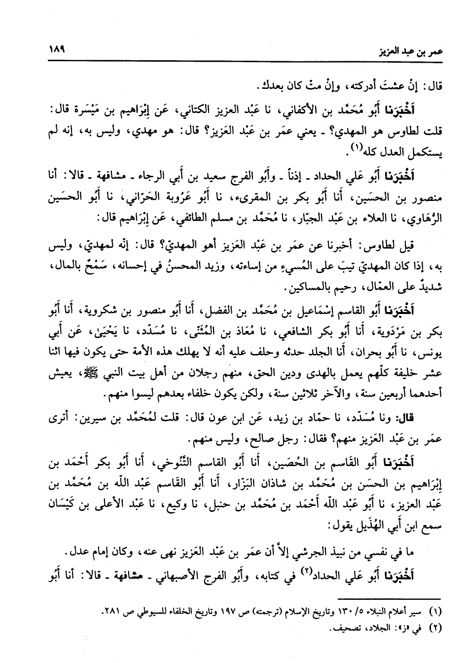 قال إن عشت أدركته وإن مت كان بعدك أخبرنا أبو محمد بن الأكفاني نا عبد العزيز الكتاني عن إبراهيم بن ميسرة قال قلت لطاوس هو المهدي يعني عمر بن عبد العزيز قال هو مهدي وليس به إنه لم يستكمل العدل كله (1) أخبرنا أبو علي الحداد إذنا وأبو الفرج سعيد بن أبي الرجاء مشافهة قالا أنا منصور بن الحسين أنا أبو بكر بن المقرئ نا أبو عروبة الحراني نا أبو الحسين الرهاوي نا العلاء بن عبد الجبار نا محمد بن مسلم الطائفي عن إبراهيم قال قيل لطاوس أخبرنا عن عمر بن عبد العزيز أهو المهدي قال إنه لمهدي وليس به إذا كان المهدي تيب على المسئ من إساءته وزيد المحسن في إحسانه سمح بالمال شديد على العمال رحيم بالمساكين أخبرنا أبو القاسم إسماعيل بن محمد بن الفضل أنا أبو منصور بن شكروية أنا أبو بكر بن مردوية أنا أبو بكر الشافعي نا معاذ بن المثنى نا مسدد نا يحيى عن أبي يونس نا أبو بحران أنا الجلد حدثه وحلف عليه أنه لا يهلك هذه الأمة حتى يكون فيها اثنا عشر خليفة كلهم يعمل بالهدى ودين الحق منهم رجلان من أهل بيت النبي (صلى الله عليه وسلم) يعيش أحدهما أربعين سنة والآخر ثلاثين سنة ولكن يكون خلفاء بعدهم ليسوا منهم قال ونا مسدد نا حماد بن زيد عن ابن عون قال قلت لمحمد بن سيرين أترى عمر بن عبد العزيز منهم فقال رجل صالح وليس منهم أخبرنا أبو القاسم بن الحصين أنا أبو القاسم التنوخي أنا أبو بكر أحمد بن إبراهيم بن الحسن بن محمد بن شاذان البزار أنا أبو القاسم عبد الله بن محمد بن عبد العزيز نا أبو عبد الله أحمد بن محمد بن حنبل نا وكيع نا عبد الأعلى بن كيسان سمع ابن أبي الهذيل يقول ما في نفسي من نبيذ الجرشي إلا أن عمر بن عبد العزيز نهى عنه وكان إمام عدل أخبرنا أبو علي الحداد (2) في كتابه وأبو الفرج الأصبهاني مشافهة قالا أنا أبو