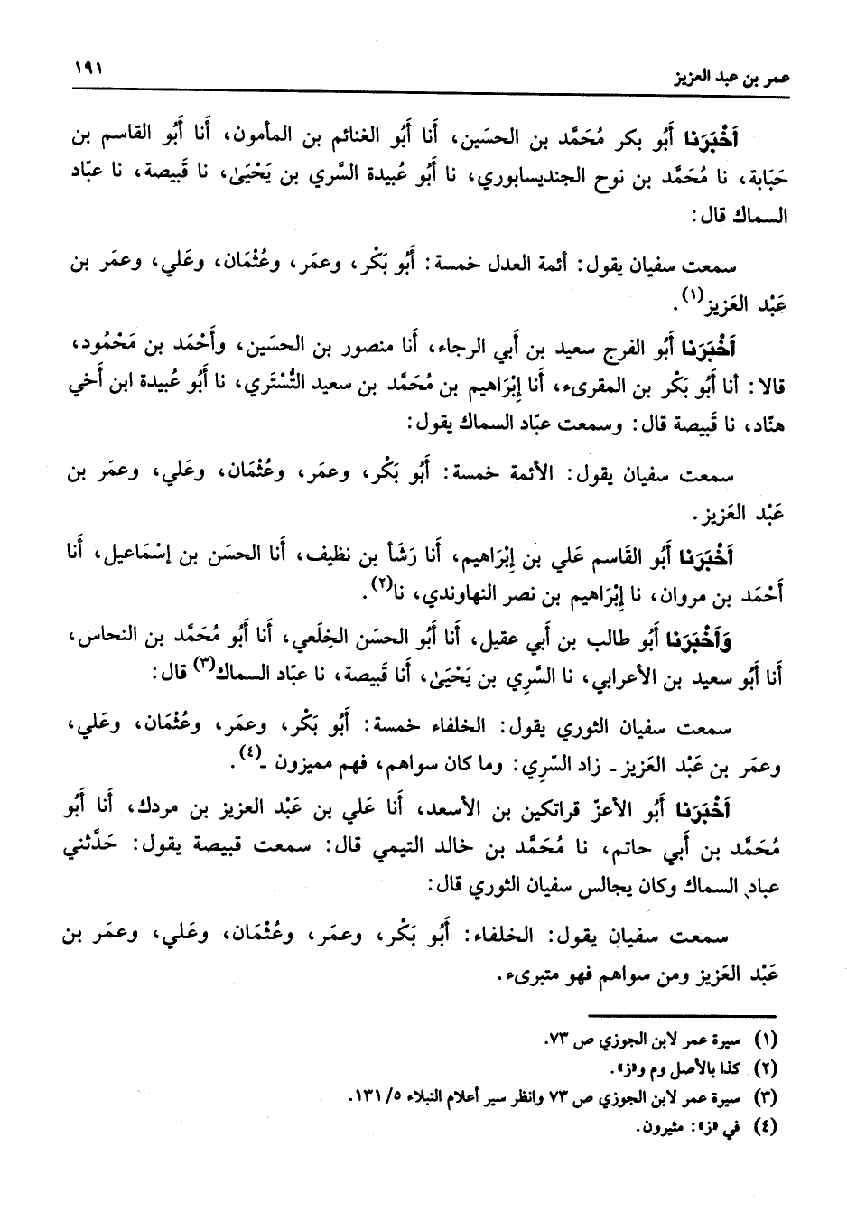 أخبرنا أبو بكر محمد بن الحسين انا أبو الغنائم بن المؤمون انا أبو القاسم بن حبابة نا محمد بن نوح الجنديسابورى نا أبو عبيدة السرى بن يحيى نا قبيضة نا عباد السماك قال سمعت سفيان يقول ائمة العدل خمسة أبو بكر وعمر وعثمان وعلى وعمر بن عبد العزيز (1) اخبرنا أبو الفرج سعيد بن رجاء انا المنصور بن الحسين واحمد بن محمود قالا انا أبو بكر المقرى انا ابراهيم بن محمد بن سعيد اليسيرى نا أبو عبيدة ابن اخى هناد نا قبيصة قال وسمت عباد السماك يقول سمعت سفيان يقول الأئمة خمسة أبو بكر وعمر وعثمان وعلي وعمر بن عبد العزيز أخبرنا أبو القاسم علي بن إبراهيم أنا رشأ بن نظيف أنا الحسن بن إسماعيل أنا أحمد بن مروان نا إبراهيم بن نصر النهاوندي نا (2) وأخبرنا أبو طالب بن أبي عقيل أنا أبو الحسن الخلعي أنا أبو محمد بن النحاس أنا أبو سعيد بن الأعرابي نا السري بن يحيى أنا قبيصة نا عباد السماك (3) قال سمعت سفيان الثوري يقول الخلفاء خمسة أبو بكر وعمر وعثمان وعلي وعمر بن عبد العزيز زاد السري وما كان سواهم فهم مميزون (4) أخبرنا أبو الأعز قراتكين بن الأسعد أنا علي بن عبد العزيز بن مردك أنا أبو محمد بن أبي حاتم نا محمد بن خالد التيمي قال سمعت قبيصة يقول حدثني عباد السماك وكان يجالس سفيان الثوري قال سمعت سفيان يقول الخلفاء أبو بكر وعمر وعثمان وعلي وعمر بن عبد العزيز ومن سواهم فهو متبرئ