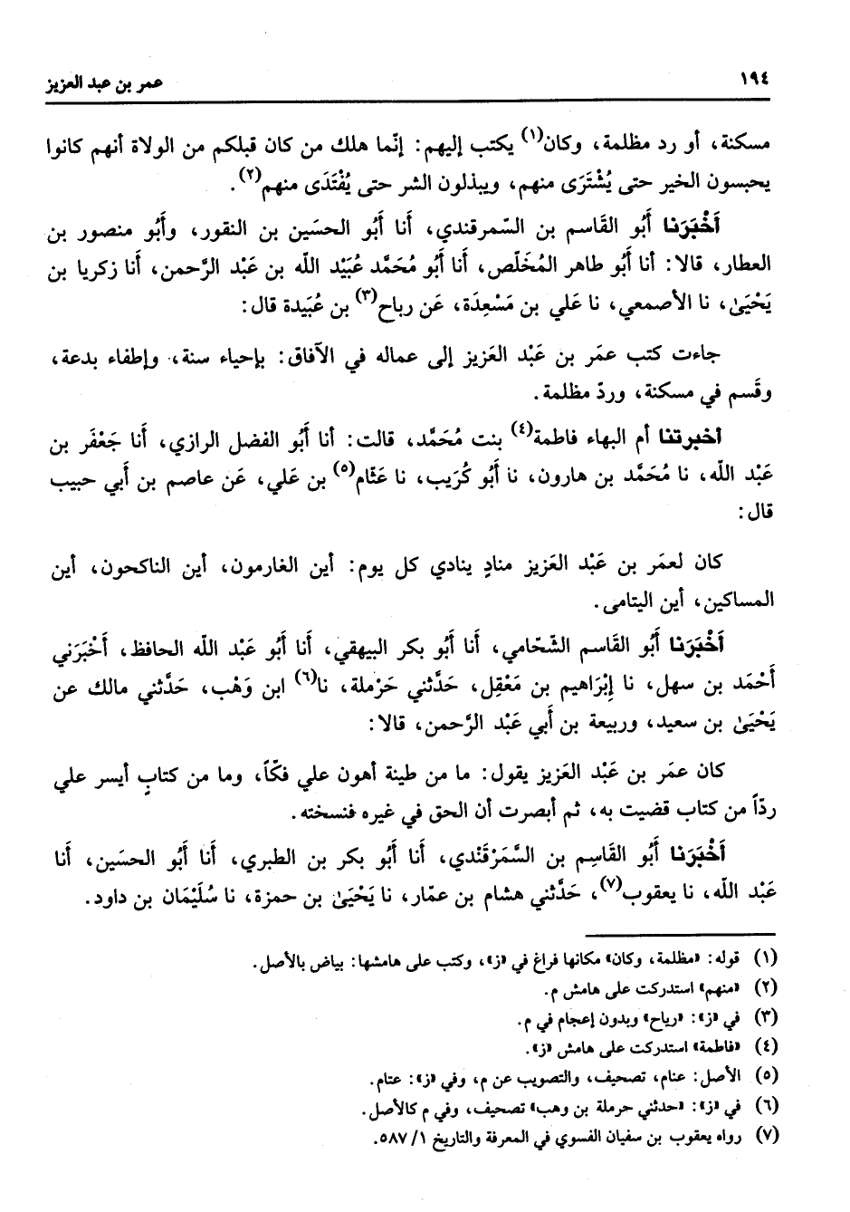 مسكنة أو رد مظلمة وكان (1) يكتب إليهم إنما هلك من كان قبلكم من الولاة أنهم كانوا يحبسون الخير حتى يشترى منهم ويبذلون الشر حتى يفتد منهم (2) أخبرنا أبو القاسم بن السمرقندي أنا أبو الحسين بن النقور وأبو منصور بن العطار قالا أنا أبو طاهر المخلص أنا أبو محمد عبيد الله بن عبد الرحمن أنا زكريبن يحيى نا الأصمعي نا علي بن مسعدة عن رباح (3) بن عبيدة قال جاءت كتب عمر بن عبد العزيز إلى عماله في الآفاق بإحياء سنة وإطفاء بدعة وقسم في مسكنة ورد مظلمة أخبرتنا أم البهاء فاطمة (4) بنت محمد قالت أنا أبو الفضل الرازي أنا جعفر بن عبد الله نا محمد بن هارون نا أبو كريب نا عثام (5) بن علي عن عاصم بن أبي حبيب قال كان لعمر بن عبد العزيز مناد ينادي كل يوم أين الغارمون أين الناكحون أين المساكين أين اليتامى أخبرنا أبو القاسم الشحامي أنا أبو بكر البيهقي أنا أبو عبد الله الحافظ أخبرني أحمد بن سهل نا إبراهيم بن معقل حدثني حرملة نا (6) ابن وهب حدثني مالك عن يحيى بن سعيد وربيعة بن أبي عبد الرحمن قالا كان عمر بن عبد العزيز يقول ما من طينة أهون علي فكا وما من كتاب أيسر علي ردا من كتاب قضيت به ثم أبصرت أن الحق في غيره فنسخته أخبرنا أبو القاسم بن السمرقندي أنا أبو بكر بن الطبري أنا أبو الحسين أنا عبد الله نا يعقوب (7) حدثني هشام بن عمار نا يحيى بن حمزة نا سليمان بن داود