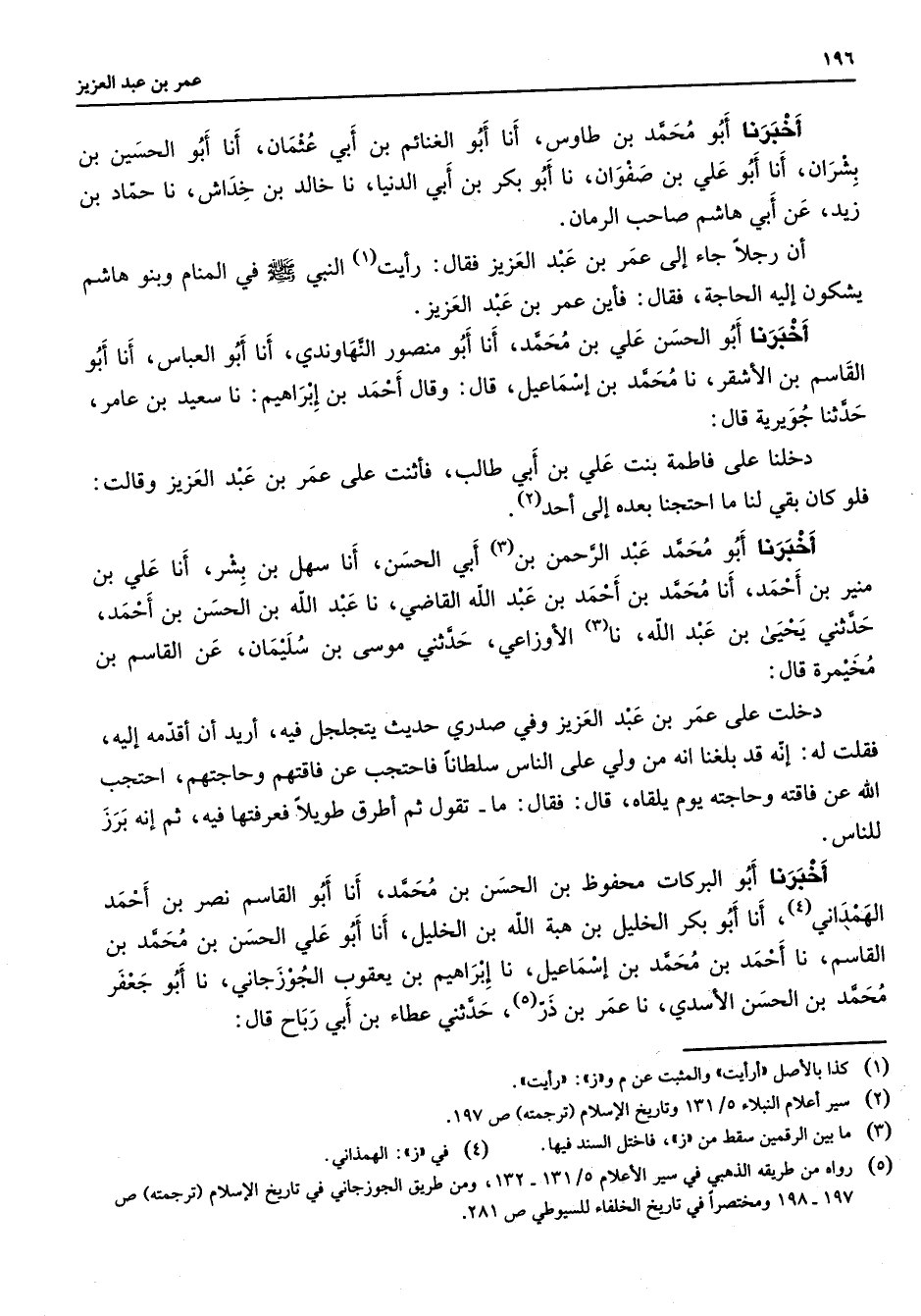 أخبرنا أبو محمد بن طاوس أنا أبو الغنائم بن أبي عثمان أنا أبو الحسين بن بشران أنا أبو علي بن صفوان نا أبو بكر بن أبي الدنيا نا خالد بن خداش نا حماد بن زيد عن أبي هاشم صاحب الرمان أن رجلا جاء إلى عمر بن عبد العزيز فقال رأيت (1) النبي (صلى الله عليه وسلم) في المنام وبنو هاشم يشكون إليه الحاجة فقال فأين عمر بن عبد العزيز أخبرنا أبو الحسن علي بن محمد أنا أبو منصور النهاوندي أنا أبو العباس أنا أبو القاسم بن الأشقر نا محمد بن إسماعيل قال وقال أحمد بن إبراهيم نا سعيد بن عامر حدثنا جويرية قال دخلنا على فاطمة بنت علي بن أبي طالب فأثنت على عمر بن عبد العزيز وقالت فلو كان بقي لنا ما احتجنا بعده إلى أحد (2) أخبرنا أبو محمد عبد الرحمن بن (3) أبي الحسن أنا سهل بن بشر أنا علي بن منيربن أحمد أنا محمد بن أحمد بن عبد الله القاضي نا عبد الله بن الحسن بن أحمد حدثني يحيى بن عبد الله نا (3) الأوزاعي حدثني موسى بن سليمان عن القاسم بن مخيمرة قال دخلت على عمر بن عبد العزيز وفي صدري حديث يتجلجل فيه أريد أن أقدمه إليه فقلت له إنه قد بلغنا أنه من ولي على الناس سلطانا فاحتجب عن فاقتهم وحاجتهم احتجب الله عن فاقته وحاجته يوم يلقاه قال فقال ما تقول ثم أطرق طويلا فعرفتها فيه ثم إنه برز للناس أخبرنا أبو البركات محفوظ بن الحسن بن محمد أنا أبو القاسم نصر بن أحمد الهمداني (4) أنا أبو بكر الخليل بن هبة الله بن الخليل أنا أبو علي الحسن بن محمد بن القاسم نا أحمد بن محمد بن إسماعيل نا إبراهيم بن يعقوب الجوزجاني نا أبو جعفر محمد بن الحسن الأسدي نا عمر بن ذر (5) حدثني عطاء بن أبي رباح قال