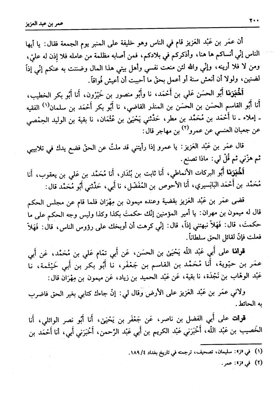 أن عمر بن عبد العزيز قام في الناس وهو خليفة على المنبر يوم الجمعة فقال يا أيها الناس إني أنساكم ها هنا وأذكركم في بلادكم فمن أصابه مظلمة من عامله فلا إذن له علي ومن لا فلا أرينه وإني والله لئن منعت نفسي وأهل بيتي هذا المال وضننت به عنكم إني إذا لضنين ولولا أن أنعش سنة أو أعمل بحق ما أحببت أن أعيش فواقا أخبرنا أبو الحسن علي بن أحمد نا وأبو منصور بن خيرون أنا أبو بكر الخطيب أنا أبو القاسم الحسن بن الحسن بن المنذر القاضي نا أبو بكر أحمد بن سلمان (1) الفقيه إملاء نا أحمد بن محمد بن مطر حدثني يحيى بن عثمان نا بقية بن الوليد الحمصي عن جعبان العنسي عن عمرو (2) بن مهاجر قال قال عمر بن عبد العزيز يا عمرو إذا رأيتني قد ملت عن الحق فضع يدك في تلابيبي ثم هزني ثم قل لي ماذا تصنع أخبرنا أبو البركات الأنماطي أنا ثابت بن بندار أنا محمد بن علي بن يعقوب أنا محمد بن أحمد البابسيري أنا الأحوص بن المفضل نا أبي حدثني أبو محمد قال قضى عمر بن عبد العزيز بقضية وعنده ميمون بن مهران فلما قام عن مجلس الحكم قال له ميمون بن مهران يا أمير المؤمنين إنك حكمت بكذا وكذا وليس وجه الحكم على ما حكمت قال فهلا نبهتني إذا قال إني كرهت أن أوبخك على رؤوس الناس قال فهلا فعلت فإن لقائل الحق سلطانا قرأنا على أبي عبد الله يحيى بن الحسن عن أبي تمام علي بن محمد عن أبي عمر بن حيوية أنا محمد بن القاسم بن جعفر نا أبو بكر بن أبي خيثمة نا عبد الوهاب بن نجدة نا بقية عن عبد الحميد بن زياد عن ميمون بن مهران قال ولاني عمر بن عبد العزيز على الأرض وقال لي إن جاءك كتابي بغير الحق فاضرب به الحائط قرأت على أبي الفضل بن ناصر عن جعفر بن يحيى أنا أبو نصر الوائلي أنا الخصيب بن عبد الله أخبرني عبد الكريم بن أبي عبد الرحمن أخبرني أبي أنا أحمد بن