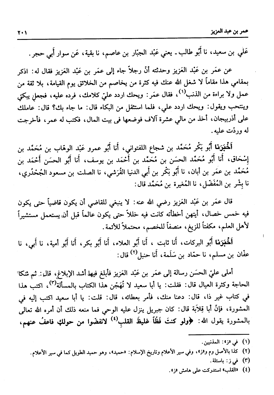علي بن سعيد نا أبو طالب يعني عبد الجبار بن عاصم نابقية عن سوار أبي حجر عن عمر بن عبد العزيز وحدثته أن رجلا جاء إلى عمر بن عبد العزيز فقال له اذكر بمقامي هذا مقاما لا شغل الله عنك فيه كثرة من يخاصم من الخلائق يوم القيامة بلا ثقة من عمل ولا براءة من الذنب (1) فقال عمر ويحك اردد علي كلامك فرده عليه فجعل يبكي وينتحب ويقول ويحك اردد علي فلما استثقل من البكا قال ما جاء بك قال عاملك على أذربيجان أخذ من مالي عشرة آلاف فوضعها في بيت المال فكتب له عمر فأخرجت له وردت عليه أخبرنا أبو بكر محمد بن شجاع اللفتواني أنا أبو عمرو عبد الوهاب بن محمد بن إسحاق أنا أبو محمد الحسن بن محمد بن أحمد بن يوسف أنا أبو الحسن أحمد بن محمد بن عمر بن أبان نا أبو بكر بن أبي الدنيا القرشي نا الصلت بن مسعود الجحدري نا بشر بن المفضل نا المغيرة بن محمد قال قال عمر بن عبد العزيز Bهـ لا ينبغي للقاضي أن يكون قاضيا حتى يكون فيه خمس خصال أيتهن أخطأته كانت فيه خللا حتى يكون عالما قبل أن يستعمل مستشيرا لأهل العلم مكفتا للزيغ منصفا للخصم محتملا للأئمة أخبرنا أبو البركات أنا ثابت أنا أبو العلاء أنا أبو بكر أنا أبو أمية نا أبي نا عفان بن مسلم نا حماد بن سلمة أنا حنبل (2) قال أملى علي الحسن رسالة إلى عمر بن عبد العزيز فأبلغ فيها أشد الإبلاغ قال ثم شكا الحاجة وكثرة العيال قال فقلت يا أبا سعيد لا تهجن هذا الكتاب بالمسألة (3) اكتب هذا في كتاب غير ذا قال دعنا منك فأمر بعطائه قال قلت يا أبا سعيد اكتب إليه في المشورة فإن أبا قلابة قال كان جبريل ينزل عليه الوحي فما منعه ذلك أن أمره الله تعالى بالمشورة يقول الله " ولو كنت فظا غليظ القلب (4) لانفضوا من حولك فاعف عنهم " "