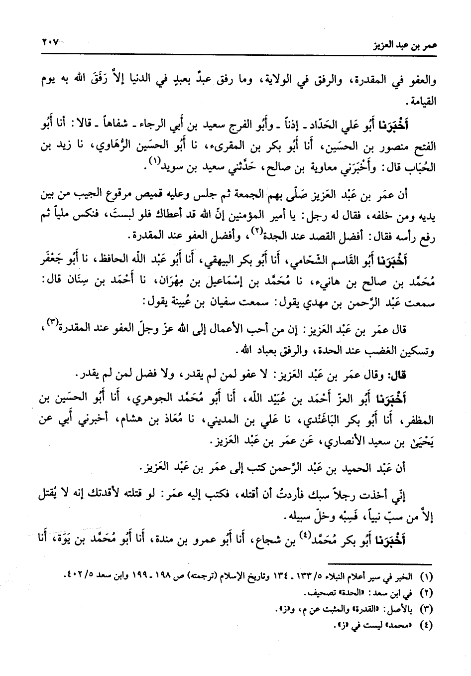والعفو في المقدرة والرفق في الولاية وما رفق عبد بعبد في الدنيا إلا رفق الله به يوم القيامة أخبرنا أبو علي الحداد إذنا وأبو الفرج سعيد بن أبي الرجاء شفاها قالا أنا أبو الفتح منصور بن الحسين أنا أبو بكر بن المقرئ نا أبو الحسين الرهاوي نا زيد بن الحباب قال وأخبرني معاوية بن صالح حدثني سعيد بن سويد (1) أن عمر بن عبد العزيز صلى بهم الجمعة ثم جلس وعليه قميص مرقوع الجيب من بين يديه ومن خلفه فقال له رجل يا أمير المؤمنين إن الله قد أعطاك فلو لبست فنكس مليا ثم رفع رأسه فقال أفضل القصد عند الجدة (2) وأفضل العفو عند المقدرة أخبرنا أبو القاسم الشحامي أنا أبو بكر البيهقي أنا أبو عبد الله الحافظ نا أبو جعفر محمد بن صالح بن هانئ نا محمد بن إسماعيل بن مهران نا أحمد بن سنان قال سمعت عبد الرحمن بن مهدي يقول سمعت سفيان بن عيينة يقول قال عمر بن عبد العزيز إن من أحب الأعمال إلى الله عز وجل العفو عند المقدرة (3) وتسكين الغضب عند الحدة والرفق بعباد الله قال وقال عمر بن عبد العزيز لا عفو لمن لم يقدر ولا فضل لمن لم يقدر أخبرنا أبو العز أحمد بن عبيد الله أنا أبو محمد الجوهري أنا أبو الحسين بن المظفر أنا أبو بكر الباغندي نا علي بن المديني نا معاذ بن هشام أخبرني أبي عن يحيى بن سعيد الأنصاري عن عمر بن عبد العزيز أن عبد الحميد بن عبد الرحمن كتب إلى عمر بن عبد العزيز إني أخذت رجلا سبك فأردت أن أقتله فكتب إليه عمر لو قتلته لأقدتك إنه لا يقتل إلا من سب نبيا فسبه وخل سبيله أخبرنا أبو بكر محمد (4) بن شجاع أنا أبو عمرو بن مندة أنا أبو محمد بن يوة