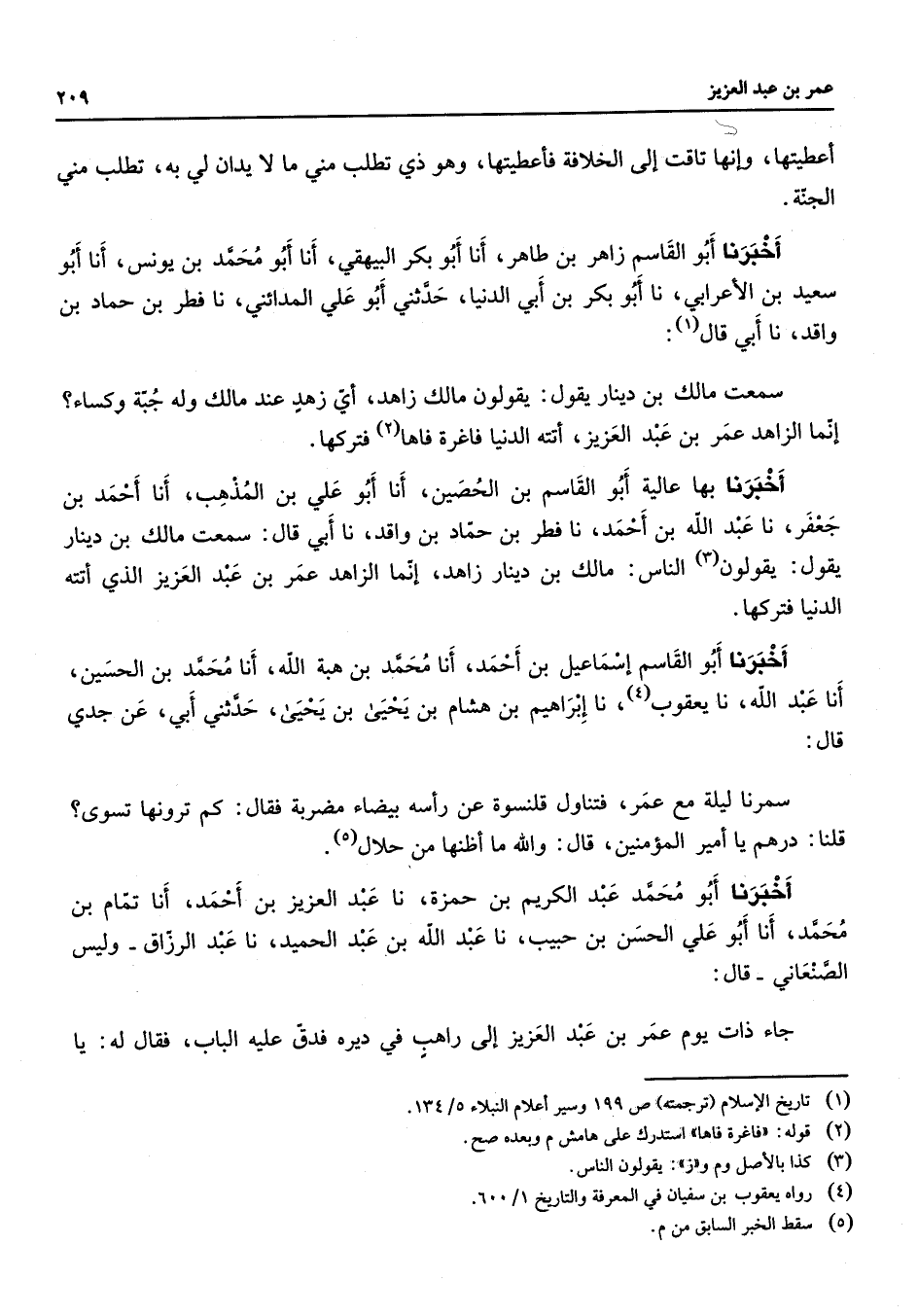 أعطيتها وإنها تاقت إلى الخلافة فأعطيتها وهو ذي تطلب مني ما لا يدان لي به تطلب مني الجنة أخبرنا أبو القاسم زاهر بن طاهر أنا أبو بكر البيهقي أنا أبو محمد بن يونس أنا أبو سعيد بن الأعرابي نا أبو بكر بن أبي الدنيا حدثني أبو علي المدائني نا فطر بن حماد بن واقد نا أبي قال (1) سمعت مالك بن دينار يقول يقولون مالك زاهد أي زهد عند مالك وله جبة وكساء إنما الزاهد عمر بن عبد العزيز أتته الدنيا فاغرة فاها (2) فتركها أخبرنا بها عالية أبو القاسم بن الحصين أنا أبو علي بن المذهب أنا أحمد بن جعفر نا عبد الله بن أحمد نا فطر بن حماد بن واقد نا أبي قال سمعت مالك بن دينار يقول يقولون (3) الناس مالك بن دينار زاهد إنما الزاهد عمر بن عبد العزيز الذي أتته الدنيا فتركها أخبرنا أبو القاسم إسماعيل بن أحمد أنا محمد بن هبة الله أنا محمد بن الحسين أنا عبد الله نا يعقوب (4) نا إبراهيم بن هشام بن يحيى بن يحيى حدثني أبي عن جدي قال سمرنا ليلة مع عمر فتناول قلنسوة عن رأسه بيضاء مضربة فقال كم ترونها تسوى قلنا درهم يا أمير المؤمنين قال والله ما أظنها من حلال (5) أخبرنا أبو محمد عبد الكريم بن حمزة نا عبد العزيز بن أحمد أنا تمام بن محمد أنا أبو علي الحسن بن حبيب نا عبد الله بن عبد الحميد نا عبد الرزاق وليس الصنعاني قال جاء ذات يوم عمر بن عبد العزيز إلى راهب في ديره فدق عليه الباب فقال له يا