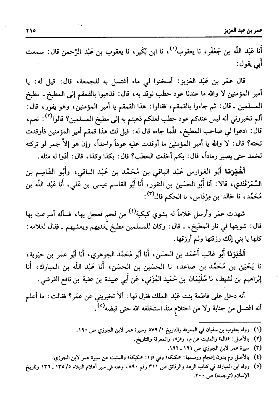أنا عبد الله بن جعفر نا يعقوب (1) نا ابن بكير نا يعقوب بن عبد الرحمن قال سمعت أبي يقول قال عمر بن عبد العزيز أسخنوا لي ماء أغتسل به للجمعة قال قيل له يا أمير المؤمنين لا والله ما عندنا عود حطب نوقد به قال فذهبوا بالقمقم إلى المطبخ مطبخ المسلمين قال ثم جاءوا بالقمقم فقالوا هذا القمقم يا أمير المؤمنين وهو يفور قال ألم تخبروني أنه ليس عندكم عود حطب لعلكم ذهبتم به إلى مطبخ المسلمين قالوا (2) نعم قال ادعوا لي صاحب المطبخ فلما جاءه قال له قيل لك هذا قمقم أمير المؤمنين فأوقدت تحته قالا والله يا أمير المؤمنين ما أوقدت عليه عودا واحدا وإن هو إلا جمر لو تركته لخمد حتى يصير رمادا قال بكم أخذت الحطب قال بكذا وكذا قال أدوا له مثله أخبرنا أبو الفوارس عبد الباقي بن محمد بن عبد الباقي وأبو القاسم بن السمرقندي قالا أنا أبو الحسين بن النقور أنا أبو القاسم عيسى بن علي أنا عبد الله بن محمد نا خالد بن مرداس نا الحكم قال (3) شهدت عمر وأرسل غلاما له يشوي كبكبة (4) من لحم فعجل بها فسأله أسرعت بها قال شويتها في نار المطبخ قال وكان للمسلمين مطبيغديهم ويعشيهم فقال لغلامه كلها يا بني إنك رزقتها ولم أرزقها أخبرنا أبو غالب أحمد بن الحسن أنا أبو محمد الجوهري أنا أبو عمر بن حيوية نا يحيى بن محمد بن صاعد نا الحسين بن الحسن أنا عبد الله بن المبارك أنا إبراهيم بن نشيط نا سليمان بن حميد المزني عن أبي عبيدة بن عقبة بن نافع القرشي أنه دخل على فاطمة بنت عبد الملك فقال لها ألا تخبريني عن عمر فقالت ما أعلم أنه اغتسل من جنابة ولا من احتلام منذ استخلفه الله حتى قبضه (5)
