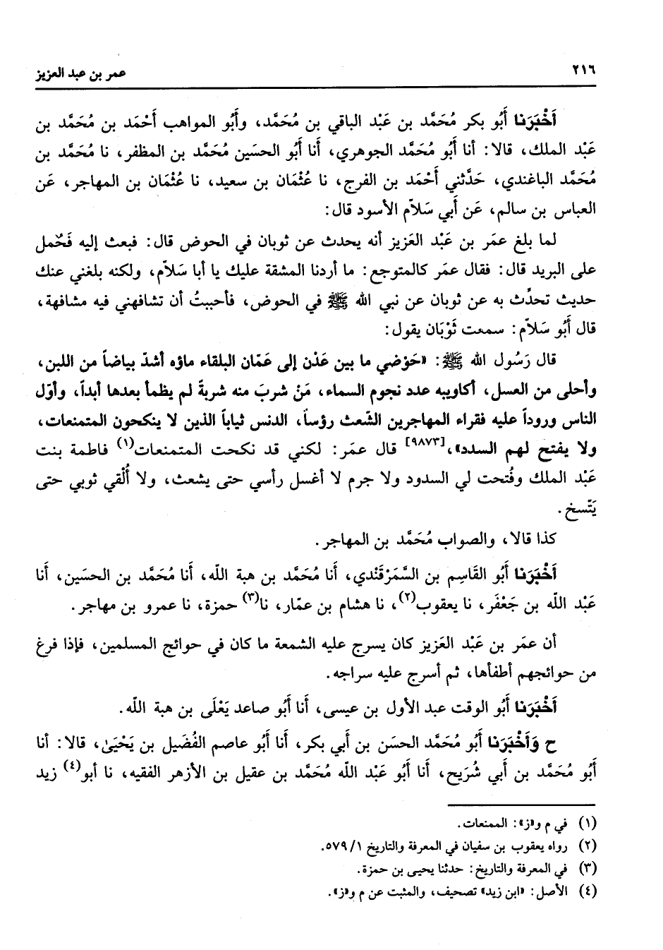أخبرنا أبو بكر محمد بن عبد الباقي بن محمد وأبو المواهب أحمد بن محمد بن عبد الملك قالا أنا أبو محمد الجوهري أنا أبو الحسين محمد بن المظفر نا محمد بن محمد الباغندي حدثني أحمد بن الفرج نا عثمان بن سعيد نا عثمان بن المهاجر عن العباس بن سالم عن أبي سلام الأسود قال لما بلغ عمر بن عبد العزيز أنه يحدث عن ثوبان في الحوض قال فبعث إليه فحمل على البريد قال فقال عمر كالمتوجع ما أردنا المشقة عليك يا أبا سلام ولكنه بلغني عنك حديث تحدث به عن ثوبان عن نبي الله (صلى الله عليه وسلم) في الحوض فأحببت أن تشافهني فيه مشافهة قال أبو سلام سمعت ثوبان يقول قال رسول الله (صلى الله عليه وسلم) حوضي ما بين عدن إلى عمان البلقاء ماؤه أشد بياضا من اللبن وأحلى من العسل أكاويبه عدد نجوم السماء من شرب منه شربة لم يظمأ بعدها أبدا وأول الناس ورودا عليه فقراء المهاجرين الشعث رؤسا الدنس ثيابا الذين لا ينكحون المتمنعات ولا يفتح لهم السدد قال عمر لكني قد نكحت المتمنعات (1) فاطمة بنت عبد الملك وفتحت لي السدود ولا جرم لا أغسل رأسي حتى يشعث ولا ألقي ثوبي حتى يتسخ كذا قالا والصواب محمد بن المهاجر أخبرنا أبو القاسم بن السمرقندي أنا محمد بن هبة الله أنا محمد بن الحسين أنا عبد الله بن جعفر نا يعقوب (2) نا هشام بن عمار نا (3) حمزة نا عمرو بن مهاجر أن عمر بن عبد العزيز كان يسرج عليه الشمعة ما كان في حوائج المسلمين فإذا فرغ من حوائجهم أطفأها ثم أسرج عليه سراجه أخبرنا أبو الوقت عبد الأول بن عيسى أنا أبو صاعد يعلى بن هبة الله ح وأخبرنا أبو محمد الحسن بن أبي بكر أنا أبو عاصم الفضيل بن يحيى قالا أنا أبو محمد بن أبي شريح أنا أبو عبد الله محمد بن عقيل بن الأزهر الفقيه نا أبو (4) زيد