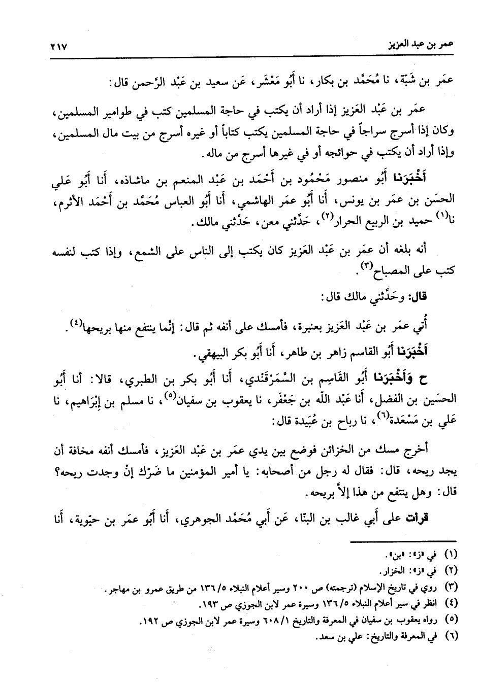 عمر بن شبة نا محمد بن بكار نا أبو معشر عن سعيد بن عبد الرحمن قال عمر بن عبد العزيز إذا أراد أن يكتب في حاجة المسلمين كتب في طوامير المسلمين وكان إذا أسرج سراجا في حاجة المسلمين يكتب كتابا أو غيره أسرج من بيت مال المسلمين وإذا أراد أن يكتب في حوائجه أو في غيرها أسرج من ماله أخبرنا أبو منصور محمود بن أحمد بن عبد المنعم بن ماشاذه أنا أبو علي الحسن بن عمر بن يونس أنا أبو عمر الهاشمي أنا أبو العباس محمد بن أحمد الأثرم نا (1) حميد بن الربيع الحرار (2) حدثني معن حدثني مالك أنه بلغه أن عمر بن عبد العزيز كان يكتب إلى الناس على الشمع وإذا كتب لنفسه كتب على المصباح (3) قال وحدثني مالك قال أتي عمر بن عبد العزيز بعنبرة فأمسك على أنفه ثم قال إنما ينتفع منها بريحها (4) أخبرنا أبو القاسم زاهر بن طاهر أنا أبو بكر البيهقي ح وأخبرنا أبو القاسم بن السمرقندي أنا أبو بكر بن الطبري قالا أنا أبو الحسين بن الفضل أنا عبد الله بن جعفر نا يعقوب بن سفيان (5) نا مسلم بن إبراهيم نا علي بن مسعدة (6) نارباح بن عبيدة قال أخرج مسك من الخزائن فوضع بين يدي عمر بن عبد العزيز فأمسك أنفه مخافة أن يجد ريحه قال فقال له رجل من أصحابه يا أمير المؤمنين ما ضرك إن وجدت ريحه قال وهل ينتفع من هذا إلا بريحه قرأت على أبي غالب بن البنا عن أبي محمد الجوهري أنا أبو عمر بن حيوية أنا