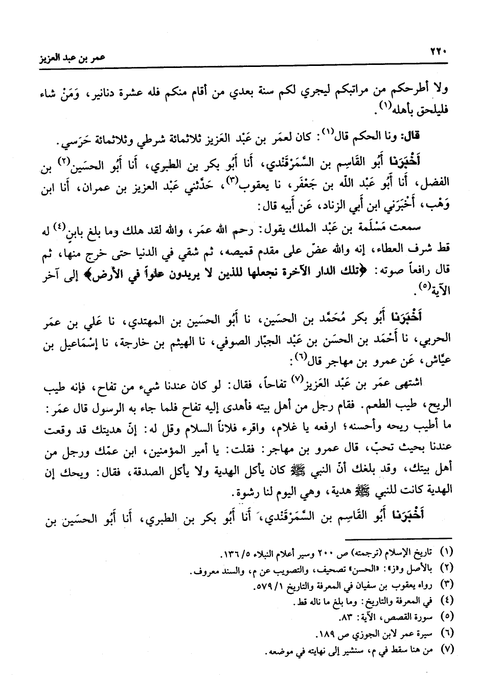 ولا أطرحكم من مراتبكم ليجري لكم سنة بعدي من أقام منكم فله عشرة دنانآير ومن شاء فليلحق بأهله (1) قال ونا الحكم قال (1) كان لعمر بن عبد العزيز ثلاثمائة شرطي وثلاثمائة حرسي أخبرنا أبو القاسم بن السمرقندي أنا أبو بكر بن الطبري أنا أبو الحسين (2) بن الفضل أنا أبو عبد الله بن جعفر نا يعقوب (3) حدثني عبد العزيز بن عمران أنا ابن وهب أخبرني ابن أبي الزناد عن أبيه قال سمعت مسلمة بن عبد الملك يقول رحم الله عمر والله لقد هلك وما بلغ بابن (4) له قط شرف العطاء إنه والله عض على مقدم قميصه ثم شقي في الدنيا حتى خرج منها ثم قال رافعا صوته " تلك الدار الآخرة نجعلها للذين لا يريدون علوا في الأرض " إلى آخر الآية (5) أخبرنا أبو بكر محمد بن الحسين نا أبو الحسين بن المهتدي نا علي بن عمر الحربي نا أحمد بن الحسن بن عبد الجبار الصوفي نا الهيثم بن خارجة نا إسماعيل بن عياش عن عمرو بن مهاجر قال (6) اشتهى عمر بن عبد العزيز (7) تفاحا فقال لو كان عندنا شئ من تفاح فإنه طيب الريح طيب الطعم فقام رجل من أهل بيته فأهدى إليه تفاحه فلما جاء به الرسول قال عمر ما أطيب ريحه وأحسنه ارفعه يا غلام واقرء فلانا السلام وقل له إن هديتك قد وقعت عندنا بحيث تحب قال عمرو بن مهاجر فقلت يا أميه المؤمنين ابن عمك ورجل من أهل بيتك وقد بلغك أن النبي (صلى الله عليه وسلم) كان يأكل الهدية ولا يأكل الصدقة فقال ويحك إن الهدية كانت للنبي (صلى الله عليه وسلم) هدية وهي اليوم لنا رشوة أخبرنا أبو القاسم بن السمرقندي أنا أبو بكر بن الطبري أنا أبو الحسين بن