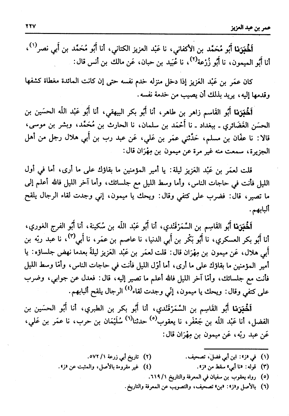 أخبرنا أبو محمد بن الأكفاني نا عبد العزيز الكتاني أنا أبو محمد بن أبي نصر (1) أنا أبو الميمون نا أبو زرعة (2) نا عبيد بن حبان عن مالك بن أنس قال كان عمر بن عبد العزيز إذا دخل منزله خدم نفسه حتى إن كانت المائدة مغطاة كشفها وقدمها إليه يريد بذلك أن يصيب من خدمة نفسه أخبرنا أبو القاسم زاهر بن طاهر أنا أبو بكر البيهقي أنا أبو عبد الله الحسين بن الحسن الغضائري ببغداد نا أحمد بن سلمان نا الحارث بن محمد وبشر بن موسى قالا نا عفان بن مسلم حدثني عمر بن علي عن عبد رب بن أبي هلال رجل من أهل الجزيرة سمعت منه غير مرة عن ميمون بن مهران قال قلت لعمر بن عبد العزيز ليلة يا أمير المؤمنين ما بقاؤك على ما أرى أما في أول الليل فأنت في حاجات الناس وأما وسط الليل مع جلسائك وأما آخر الليل فالله أعلم إلى ما تصير قال فضرب على كتفي وقال ويحك يا ميمون إني وجدت لقاء الرجال يلقح ألبابهم أخبرنا أبو القاسم بن السمرقندي أنا أبو عبد الله بن سكينة أنا أبو الفرج الغوري أنا أبو بكر العسكري نا أبو بكر بن أبي الدنيا نا عاصم بن عمر نا أبي (3) نا عبد ربه بن أبي هلال عن ميمون بن مهران قال قلت لعمر بن عبد العزيز ليلة بعدما نهض جلساؤه يا أمير المؤمنين ما بقاؤك على ما أرى أما أول الليل فأنت في حاجات الناس وأما وسط الليل فأنت مع جلسائك وأما آخر الليل فالله أعلم ما تصير إليه قال فعدل عن جوابي وضرب على كتفي وقال ويحك يا ميمون إني وجدت لقاء (4) الرجال يلقح ألبابهم أخبرنا أبو القاسم بن السمرقندي أنا أبو بكر بن الطبري أنا أبو الحسين بن الفضل أنا عبد الله بن جعفر نا يعقوب (5) حدثنا (6) سليمان بن حرب نا عمر بن علي عن عبد ربه عن ميمون بن مهران قال