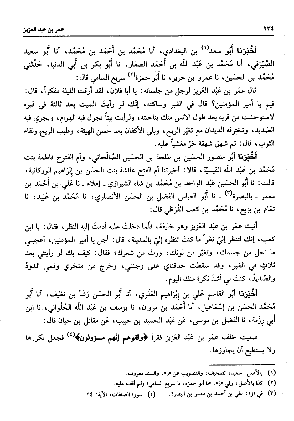 أخبرنا أبو سعد (1) بن البغدادي أنا محمد بن أحمد بن محمد أنا أبو سعيد الصيرفي أنا محمد بن عبد الله بن أحمد الصفار نا أبو بكر بن أبي الدنيا حدثني محمد بن الحسين نا عمرو بن جرير نا أبو حمزة (2) سريع السامي قال قال عمر بن عبد العزيز لرجل من جلسائه يا أبا فلان لقد أرقت الليلة مفكرا قال فيم يا أمير المؤمنين قال في القبر وساكنه إنك لو رأيت الميت بعد ثالثة في قبره لاستوحشت من قربه بعد طول الأنس منك بناحيته ولرأيت بيتا تجول فيه الهوام ويجري فيه الصديد وتخترقه الديدان مع تغير الريح وبلى الأكفان بعد حسن الهيئة وطيب الريح ونقاء الثوب قال ثم شهق شهقه خر مغشيا عليه أخبرنا أبو منصور الحسين بن طلحة بن الحسين الصالحاني وأم الفتوح فاطمة بنت محمد بن عبد الله القيسية قالا أخبرتنا أم الفتح عائشة بنت الحسن بن إبراهيم الوركانية قالت نا أبو الحسين عبد الواحد بن محمد بن شاه الشيرازي إملاء نا علي بن أحمد بن معمر بالبصرة (3) نا أبو العباس الفضل بن الحسن الأنصاري نا محمد بن عبيد نا تمام بن بزيع نا محمد بن كعب القرظي قال أتيت عمر بن عبد العزيز وهو خليفة فلمدخلت عليه أدمت إليه النظر فقال يا ابن كعب إنك لتنظر إلي نظرا ما كنت تنظره إلي بالمدينة قال أجل يا أمير المؤمنين أعجبني ما نحل من جسمك وتغير من لونك ورث من شعرك فقال كيف بك لو رأيتني بعد ثلاث في القبر وقد سقطت حدقتاي على وجنتي وخرج من منخري وفمي الدود والصديد كنت لي أشد نكرة منك اليوم أخبرنا أبو القاسم علي بن إبراهيم العلوي أنا أبو الحسن رشأ بن نظيف أنا أبو محمد الحسن بن إسماعيل أنا أحمد بن مروان نا يوسف بن عبد الله الحلواني نا ابن أبي رزمة نا الفضل بن موسى عن عبد الحميد بن حبيب عن مقاتل بن حيان قال صليت خلف عمر بن عبد العزيز فقرأ " وقفوهم إنهم مسؤولون " (4) فجعل يكررها ولا يستطيع أن يجاوزها