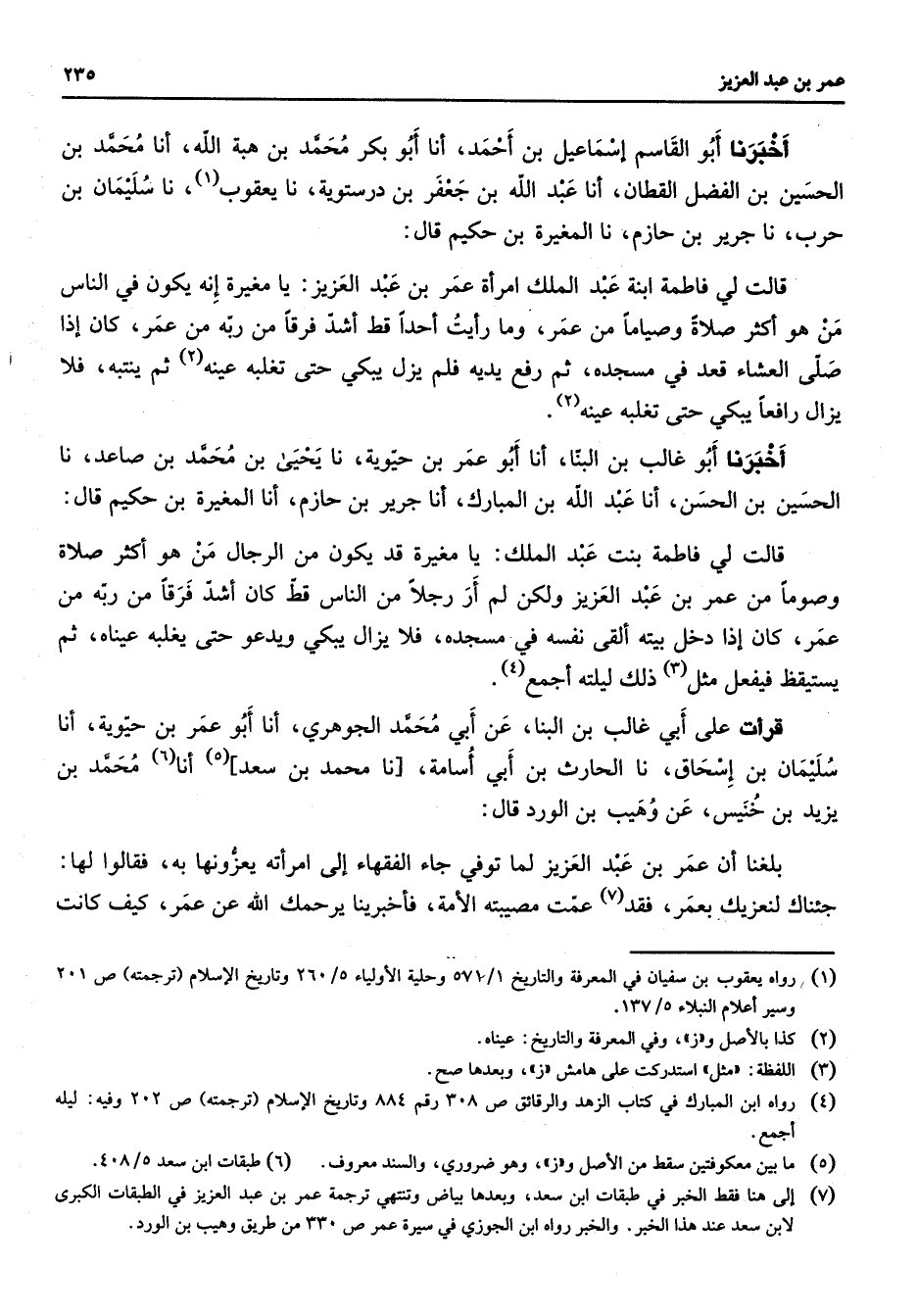 (7) إلى هنا فقط الخبر في طبقات ابن سعد وبعدها بياض وتنتهي ترجمة عمر بن عبد العزيز في الطبقات الكبرى لابن سعد عند هذا الخبر