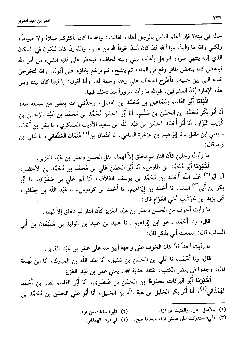 حاله في بيته فإن أعلم الناس بالرجل أهله فقالت والله ما كان بأكثركم صلاة ولا صياما ولكني والله ما رأيت عبد الله قط كان أشد خوفا لله من عمر والله إن كان ليكون في المكان الذي إليه ينتهي سرور الرجل بأهله بيني وبينه لحاف فيخطر على قلبه الشئ من أمر الله فينتفض كما ينتفض طائر وقع في الماء ثم ينشج ثم يرتفع بكاؤه حتى أقول والله لتخرجن نفسه التي بين جنبيه فأطرح اللحاف عني وعنه رحمة له وأنا أقول يا ليتنا كان بيننا وبين هذه الإمارة بعد المشرقين فوالله ما رأينا سرورا منذ دخلنا فيها أنبأنا أبو القاسم إسماعيل بن محمد بن الفضل وحدثني عنه بعض من سمعه منه أنا أبو بكر محمد بن الحسن بن سليم أنا أبو الحسن محمد بن محمد بن عبد الرحمن بن كريب البزاز أنا أبو أحمد الحسن بن عبد الله بن سعيد الأديب العسكري نا بكر بن أحمد يعني ابن مقبل نا إبراهيم بن عرعرة السامي نا عثمان بن عثمان الغطفاني نا علي بن زيد قال ما رأيت رجلين كأن النار لم تخلق إلا لهما مثل الحسن وعمر بن عبد العزيز أخبرنا أبو محمد بن طاوس أنا أبو الحسن علي بن محمد بن محمد بن الأخضر أنا أبو (2) عبد الله أحمد بن محمد بن يوسف العلاف أنا أبو علي بن صفوان نا أبو بكر بن أبي (3) الدنيا نا أحمد بن إبراهيم نا أحمد بن كردوس نا عبد الله بن خداش عن يزيد بن حوشب أخي العوام قال ما رأيت أخوف من الحسن وعمر بن عبد العزيز كأن النار لم تخلق إلا لهما قال ونا أحمد هو ابن إبراهيم نا عبيد بن عبيد بن الوليد بن سليمان بن أبي السائب قال سمعت أبي يذكر قال ما رأيت أحدا قط كان الخوف على وجهه أبين منه على عمر بن عبد العزيز قال ونا أحمد نا علي بن الحسن بن شقيق أنا عبد الله بن المبارك أنا ابن لهيعة إ قال وجدوا في بعض الكتب تقتله خشية الله يعني عمر بن عبد العزيز أخبرنا أبو البركات محفوظ بن الحسن بن صصرى أنا أبو القاسم نصر بن أحمد الهمداني (4) أنا أبو بكر الخليل بن هبة الله بن الخليل أنا أبو علي الحسن بن محمد بن