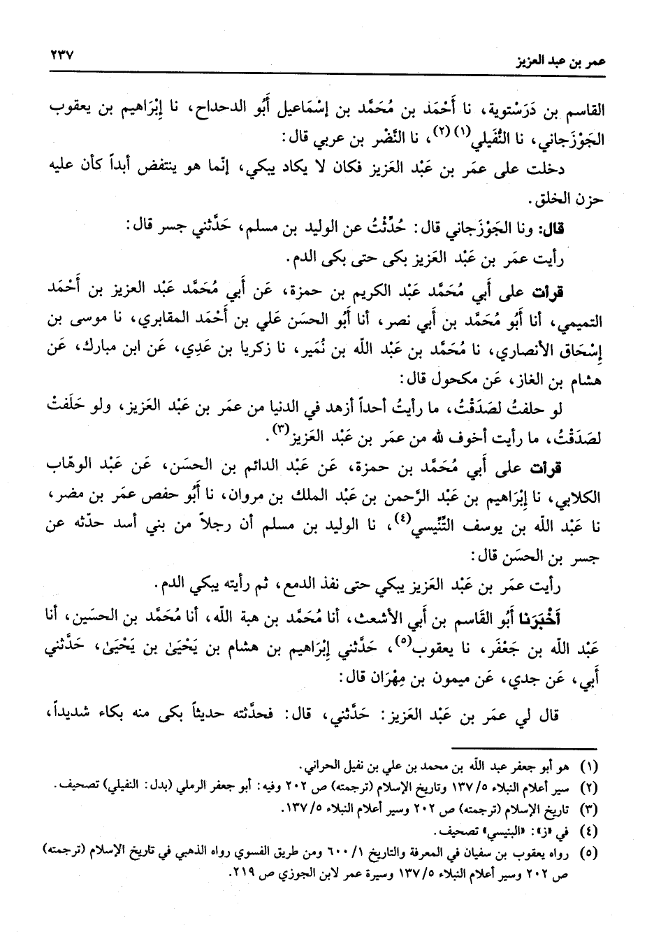 القاسم بن درستوية نا أحمد بن محمد بن إسماعيل أبو الدحداح نا إبراهيم بن يعقوب الجوزجاني نا النفيلي (1) (2) نا النضر بن عربي قال دخلت على عمر بن عبد العزيز فكان لا يكاد يبكي إنما هو ينتفض أبدا كأن عليه حزن الخلق قال ونا الجوزجاني قال حدثت عن الوليد بن مسلم حدثني جسر قال رأيت عمر بن عبد العزيز بكى حتى بكى الدم قرأت على أبي محمد عبد الكريم بن حمزة عن أبي محمد عبد العزيز بن أحمد التميمي أنا أبو محمد بن أبي نصر أنا أبو الحسن علي بن أحمد المقابري نا موسى بن إسحاق الأنصاري نا محمد بن عبد الله بن نمير نا زكريا بن عدي عن ابن مبارك عن هشام بن الغاز عن مكحول قال لو حلفت لصدقت ما رأيت أحدا أزهد في الدنيا من عمر بن عبد العزيز ولو حلفت لصدقت ما رأيت أخوف لله من عمر بن عبد العزيز (3) قرأت على أبي محمد بن حمزة عن عبد الدائم بن الحسن عن عبد الوهاب الكلابي نا إبراهيم بن عبد الرحمن بن عبد الملك بن مروان نا أبو حفص عمر بن مضر نا عبد الله بن يوسف التنيسي (4) نا الوليد بن مسلم أن رجلا من بني أسد حدثه عن جسر بن الحسن قال رأيت عمر بن عبد العزيز يبكي حتى نفذ الدمع ثم رأيته يبكي الدم أخبرنا أبو القاسم بن أبي الأشعث أنا محمد بن هبة الله أنا محمد بن الحسين أنا عبد الله بن جعفر نا يعقوب (5) حدثني إبراهيم بن هشام بن يحيى بن يحيى حدثني أبي عن جدي عن ميمون بن مهران قال قال لي عمر بن عبد العزيز حدثني قال فحدثته حديثا بكى منه بكاء شديدا