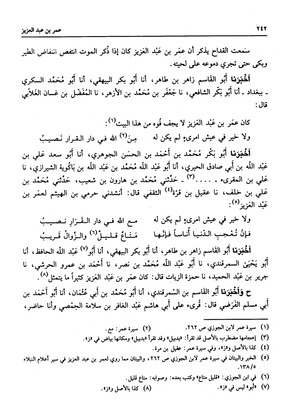 (5) الخبر والبيتان في سيرة عمر لابن الجوزي ص 262، والبيتان مما روي لعمر بن عبد العزيز في سير أعلام النبلاء 5 / 138