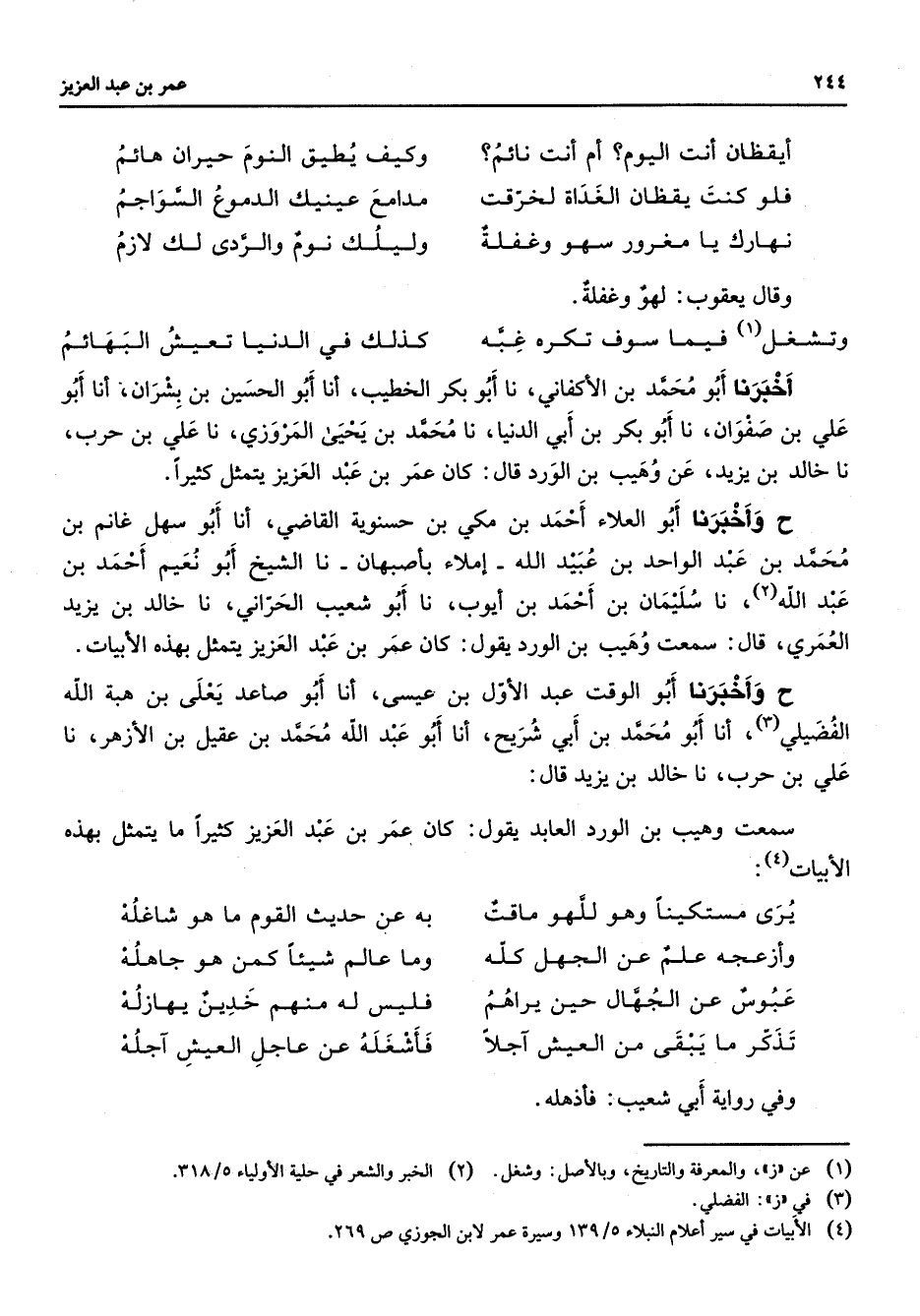 * أيقظان أنت اليوم أم أنت نائم * وكيف يطيق النوم حيران هائم فلوكنت يقظان الغداة لخرقت * مدامع عينيك الدموع السواجم نهارك يا مغرور سهو وغفلة * وليلك نوم والردى لك لازم * وقال يعقوب لهو وغفلة * وتشغل (1) فيما سوف تكره غبه * كذلك في الدنيا تعيش البهائم * أخبرنا أبو محمد بن الأكفاني نا أبو بكر الخطيب أنا أبو الحسين بن بشران أنا أبو علي بن صفوان نا أبو بكر بن أبي الدنيا نا محمد بن يحيى المروزي نا علي بن حرب نا خالد بن يزيد عن وهيب بن الورد قال كان عمر بن عبد العزيز يتمثل كثيرا ح وأخبرنا أبو العلاء أحمد بن مكي بن حسنوية القاضي أنا أبو سهل غانم بن محمد بن عبد الواحد بن عبيد الله إملاء بأصبهان نا الشيخ أبو نعيم أحمد بن عبد الله (2) نا سليمان بن أحمد بن أيوب نا أبو شعيب الحراني نا خالد بن يزيد العمري قال سمعت وهيب بن الورد يقول كان عمر بن عبد العزيز يتمثل بهذه الأبيات ح وأخبرنا أبو الوقت عبد الأول بن عيسى أنا أبو صاعد يعلى بن هبة الله الفضيلي (3) أنا أبو محمد بن أبي شريح أنا أبو عبد الله محمد بن عقيل بن الأزهر نا علي بن حرب نا خالد بن يزيد قال سمعت وهيب بن الورد العابد يقول كان عمربن عبد العزيز كثيرا ما يتمثل بهذه الأبيات (4) * يرى مستكينا وهو للهو ماقت * به عن حديث القوم ما هو شاغله وأزعجه علم عن الجهل كله * وما عالم شيئا كمن هو جاهله عبوس عن الجهال حين يراهم * فليس له منهم خدين يهازله تذكر ما يبقى من العيش آجلا * فأشغله عن عاجل العيش آجله * وفي رواية أبي شعيب فأذهله