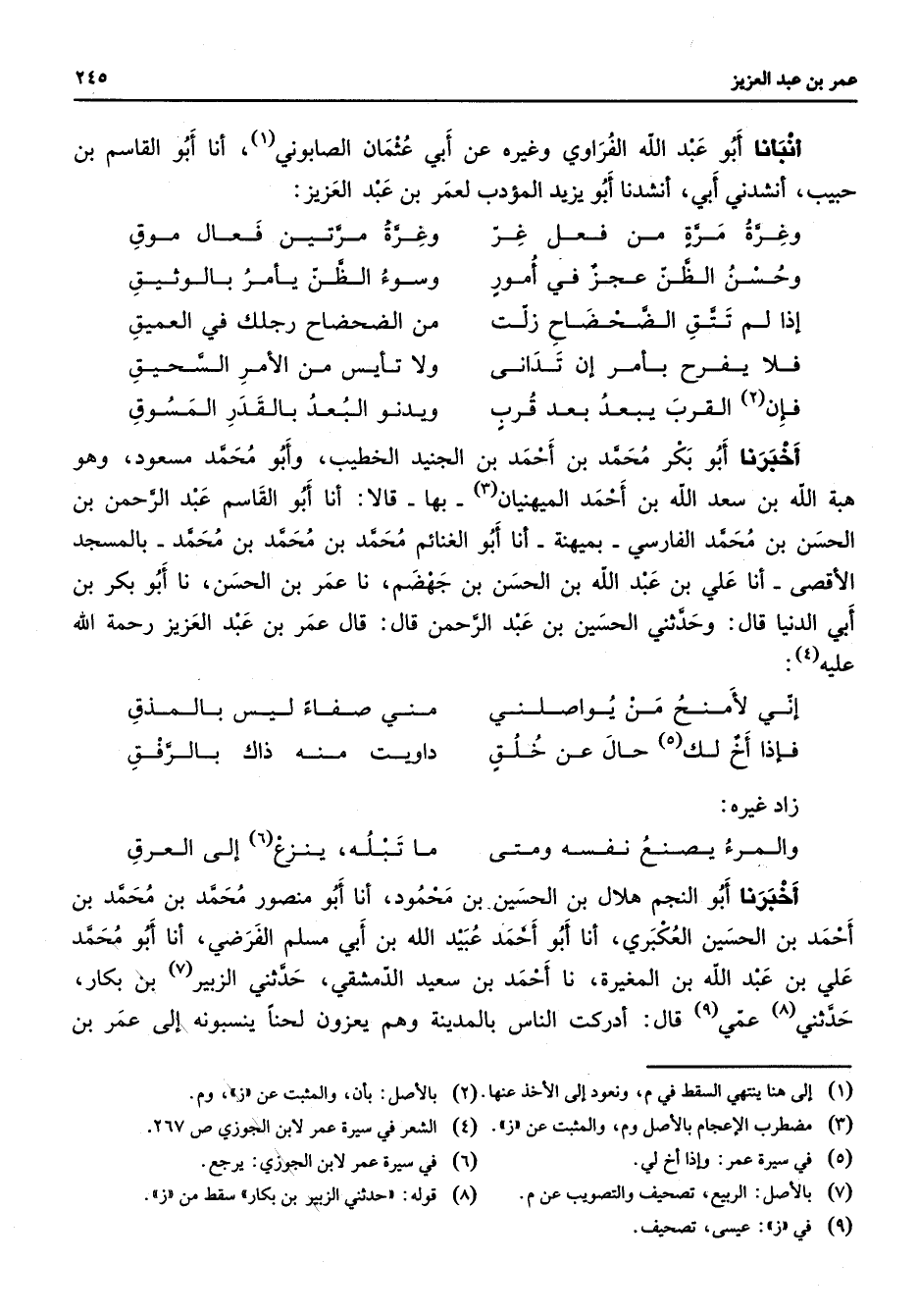 أنبأنا أبو عبد الله الفراوي وغيره عن أبي عثمان الصابوني (1) أنا أبو القاسم بن حبيب أنشدني أبي أنشدنا أبو يزيد المؤدب لعمر بن عبد العزيز * وغرة مرة من فعل غر * وغرة مرتين فعال موق وحسن الظن عجز في أمور * وسوء الظن يأمر بالوثيق إذا لم تتق الضحضاح زلت * من الضحضاح رجلك في العميق فلا يفرح بأمر إن تدانى * ولا تأيس من الأمر السحيق فإن (2) القرب يبعد بعد قرب * ويدنو البعد بالقدر المسوق * أخبرنا أبو بكر محمد بن أحمد بن الجنيد الخطيب وأبو محمد مسعود وهو هبة الله بن سعد الله بن أحمد الميهنيان (3) بها قالا أنا أبو القاسم عبد الرحمن بن الحسن بن محمد الفارسي بميهنة أنا أبو الغنائم محمد بن محمد بن محمد بالمسجد الأقصى أنا علي بن عبد الله بن الحسن بن جهضم نا عمر بن الحسن نا أبو بكر بن أبي الدنيا قال وحدثني الحسين بن عبد الرحمن قال قال عمر بن عبد العزيز رحمة الله عليه (4) * إني لأمنح من يواصلني * مني صفاء ليس بالمذق فإذا أخ لك (5) حال عن خلق * داويت منه ذاك بالرفق * زاد غيره * والمرء يصنع نفسه ومتى * ما تبله ينزع (6) إلى العرق * أخبرنا أبو النجم هلال بن الحسين بن محمود أنا أبو منصور محمد بن محمد بن أحمد بن الحسين العكبري أنا أبو أحمد عبيد الله بن أبي مسلم الفرضي أنا أبو محمد علي بن عبد الله بن المغيرة نا أحمد بن سعيد الدمشقي حدثني الزبير بن بكار حدثني (8) عمى (9) قال أدركت الناس بالمدينة وهم يعزون لحنا ينسبونه إلى عمر بن