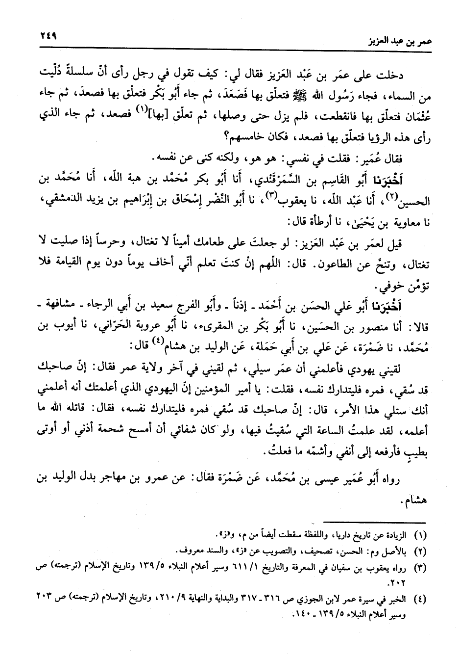 (4) الخبر في سيرة عمر لابن الجوزي ص 316 - 317 والبداية والنهاية 9 / 201، وتاريخ الإسلام (ترجمته) ص 203 وسير أعلام النبلاء 5 / 139 - 140