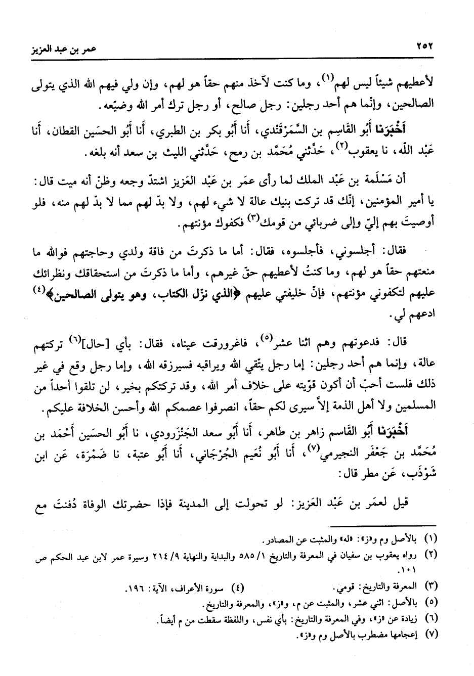 لأعطيهم شيئا ليس لهم (1) وما كنت لآخذ منهم حقا هو لهم وإن ولي فيهم الله الذي يتولى الصالحين وإنما هم أحد رجلين رجل صالح أو رجل ترك أمر الله وضيعه أخبرنا أبو القاسم بن السمرقندي أنا أبو بكر بن الطبري أنا أبو الحسين القطان أنا عبد الله نا يعقوب (2) حدثني محمد بن رمح حدثني الليث بن سعد أنه بلغه أن مسلمة بن عبد الملك لما رأى عمر بن عبد العزيز اشتد وجعه وظن أنه ميت قال يا أمير المؤمنين إنك قد تركت بنيك عالة لا شئ لهم ولا بد لهم مما لا بد لهم منه فلو أوصيت بهم إلي وإلى ضربائي من قومك (3) فكفوك مؤنتهم فقال أجلسوني فأجلسوه فقال أما ما ذكرت من فاقة ولدي وحاجتهم فو الله ما منعتهم حقا هو لهم وما كنت لأعطيهم حق غيرهم وأما ما ذكرت من استحقاقك ونظرائك عليهم لتكفوني مؤنتهم فإن خليفتي عليهم " الذي نزل الكتاب وهو يتولى الصالحين " ادعهم لي قال فدعوتهم وهم اثنا عشر (5) فاغرورقت عيناه فقال بأي حال تركتهم عالة وإنما هم أحد رجلين إما رجل يتقي الله ويراقبه فسيرزقه الله وإما رجل وقع في غير ذلك فلست أحب أن أكون قويته على خلاف أمر الله وقد تركتكم بخير لن تلقوا أحدا من المسلمين ولا أهل الذمة إلا سيرى لكم حقا انصرفوا عصمكم الله وأحسن الخلافة عليكم أخبرنا أبو القاسم زاهر بن طاهر أنا أبو سعد الجنزرودي نا أبو الحسين أحمد بن محمد بن جعفر النجيرمي (7) أنا أبو نعيم الجرجاني أنا أبو عتبة نا ضمرة عن ابن شوذب عن مطر قال قيل لعمر بن عبد العزيز لو تحولت إلى المدينة فإذا حضرتك الوفاة دفنت مع