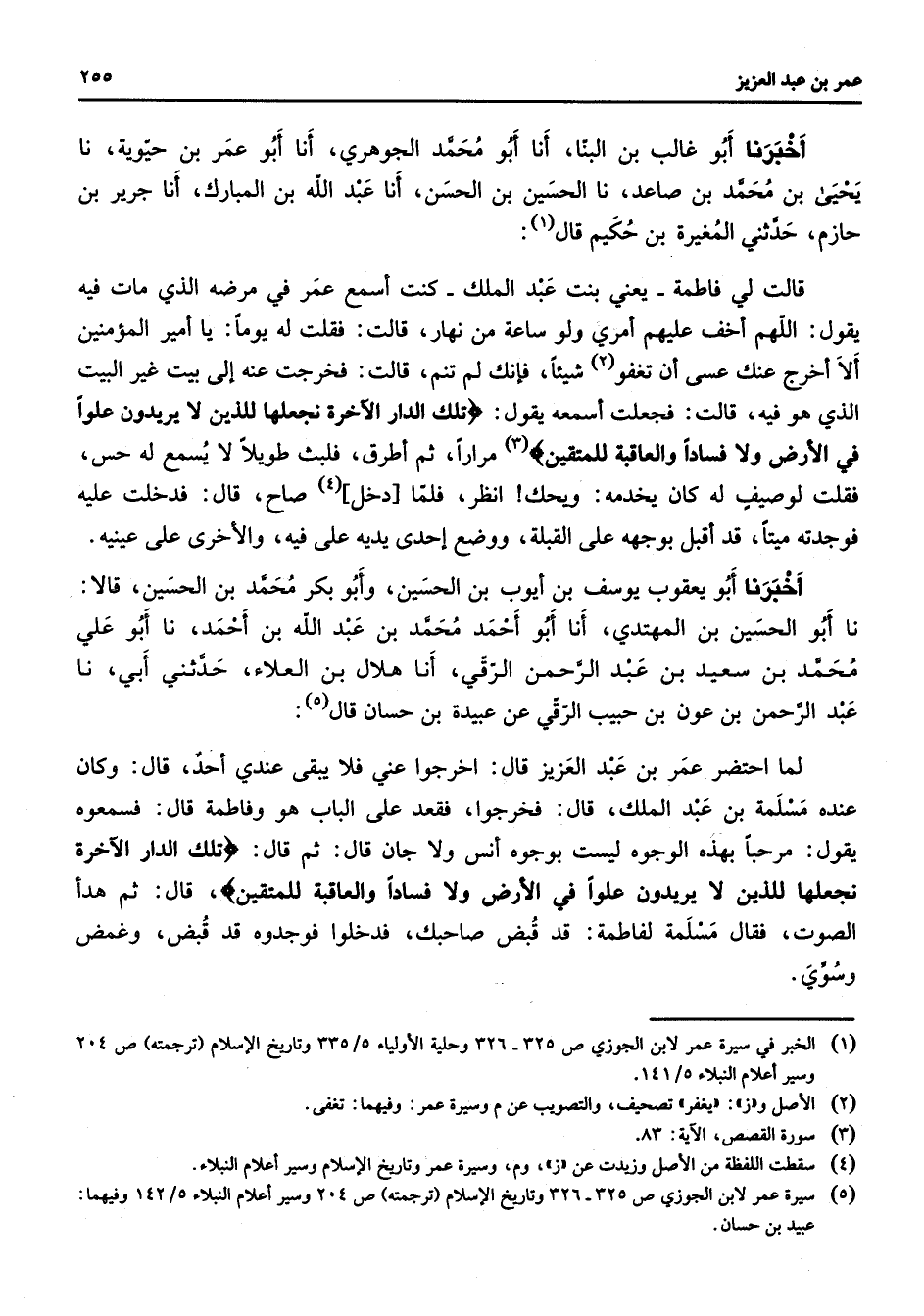 أخبرنا أبو غالب بن البنا أنا أبو محمد الجوهري أنا أبو عمر بن حيوية نا يحيى بن محمد بن صاعد نا الحسين بن الحسن أنا عبد الله بن المبارك أنا جرير بن حازم حدثني المغيرة بن حكيم قال (1) قالت لي فاطمة يعني بنت عبد الملك كنت أسمع عمر في مرضه الذي مات فيه يقول اللهم أخف عليهم أمري ولو ساعة من نهار قالت فقلت له يوما يا أمير المؤمنين ألا أخرج عنك عسى أن تغفو (2) شيئا فإنك لم تنم قالت فخرجت عنه إلى بيت غير البيت الذي هو فيه قالت فجعلت أسمعه يقول " تلك الدار الآخرة نجعلها للذين لا يريدون علوا في الأرض ولا فسادا والعاقبة للمتقين " (3) مرارا ثم أطرق فلبث طويلا لا يسمع له حس فقلت لوصيف له كان يخدمه ويحك انظر فلما دخل (4) صاح قال فدخلت عليه فوجدته ميقد أقبل بوجهه على القبلة ووضع إحدى يديه على فيه والأخرى على عينيه أخبرنا أبو يعقوب يوسف بن أيوب بن الحسين وأبو بكر محمد بن الحسين قالا نا أبو الحسين بن المهتدي أنا أبو أحمد محمد بن عبد الله بن أحمد نا أبو علي محمد بن سعيد بن عبد الرحمن الرقي أنا هلال بن العلاء حدثني أبي نا عبد الرحمن بن عون بن حبيب الرقي عن عبيدة بن حسان قال (5) لما احتضر عمر بن عبد العزيز قال اخرجوا عني فلا يبقى عندي أحد قال وكان عنده مسلمة بن عبد الملك قال فخرجوا فقعد على الباب هو فاطمة قال فسمعوه يقول مرحبا بهذه الوجوه ليست بوجوه أنس ولا جان قال ثم قال " تلك الدار الآخرة نجعلها للذين لا يريدون علوا في الأرض ولا فسادا والعاقبة للمتقين " قال ثم هدأ الصوت فقال مسلمة لفاطمة قد قبض صاحبك فدخلوا فوجدوه قد قبض وغمض وسوي