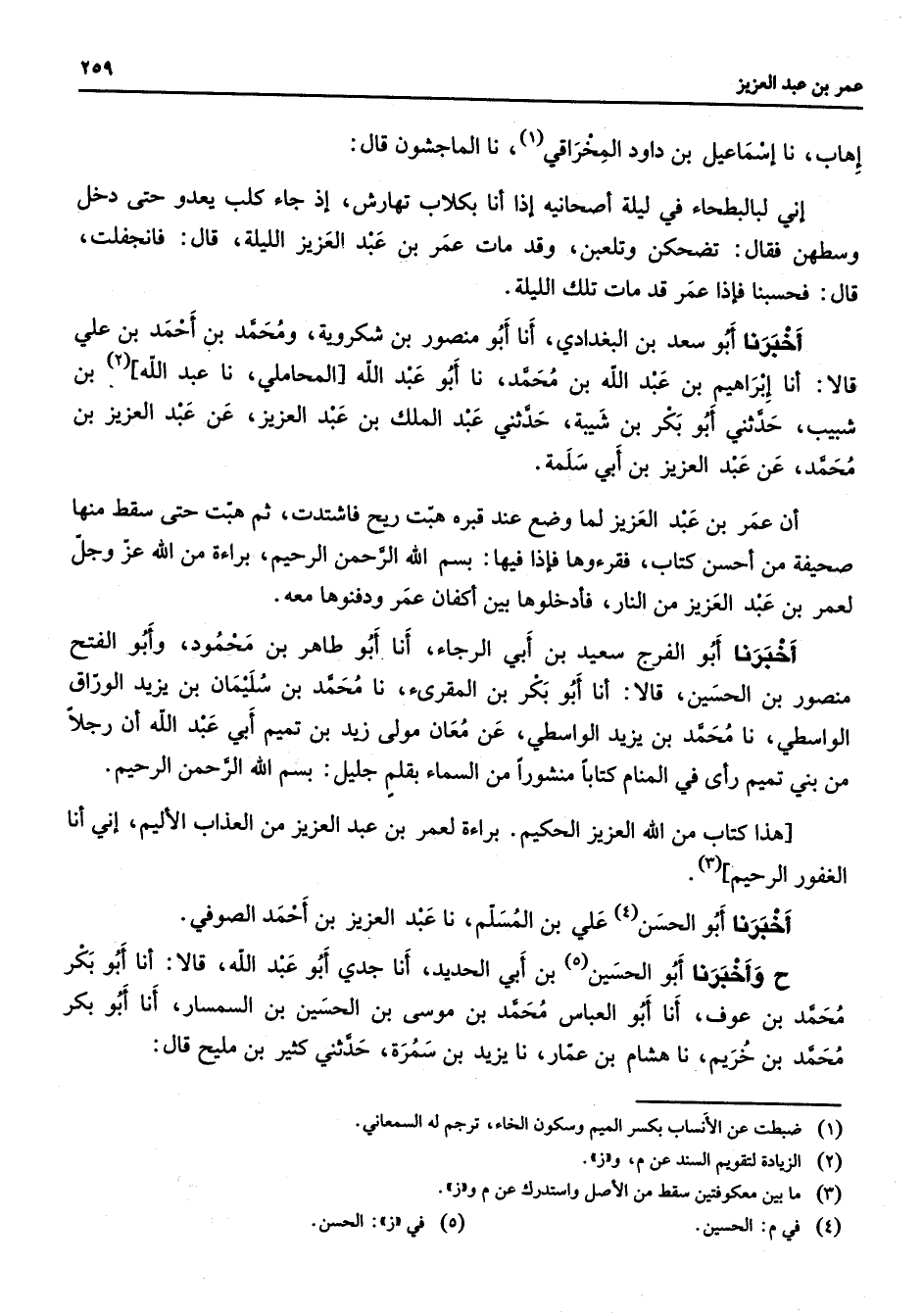 إهاب نا إسماعيل بن داود المخراقي (1) نا الماجشون قال إني لبالبطحاء في ليلة أصحانيه إذا أنا بكلاب تهارش إذ جاء كلب يعدو حتى دخل وسطهن فقال تضحكن وتلعبن وقد مات عمر بن عبد العزيز الليلة قال فانجفلت قال فحسبنا فإذا عمر قد مات تلك الليلة أخبرنا أبو سعد بن البغدادي أنا أبو منصور بن شكروية ومحمد بن أحمد بن علي قالا أنا إبراهيم بن عبد الله بن محمد نا أبو عبد الله المحاملي نا عبد الله بن شبيب حدثني أبو بكر بن شيبة حدثني عبد الملك بن عبد العزيز عن عبد العزيز بن محمد عن عبد العزيز بن أبي سلمة أن عمر بن عبد العزيز لما وضع عند قبره هبت ريح فاشتدت ثم هبت حتى سقط منها صحيفة من أحسن كتاب فقرءوها فإذا فيها بسم الله الرحمن الرحيم براءة من الله عز وجل لعمر بن عبد العزيز من النار فأدخلوها بين أكفان عمر ودفنوها معه أخبرنا أبو الفرج سعيد بن أبي الرجاء أنا أبو طاهر بن محمود وأبو الفتح منصور بن الحسين قالا أنا أبو بكر بن المقرئ نا محمد بن سليمان بن يزيد الوراق الواسطي نا محمد بن يزيد الواسطي عن معان مولى زيد بن تميم أبي عبد الله أن رجلا من بني تميم رأى في المنام كتابا منشورا من السماء بقلم جليل بسم الله الرحمن الرحيم هذا كتاب من الله العزيز الحكيم براءة لعمر بن عبد العزيز من العذاب الأليم إني أنا الغفور الرحيم (3) أخبرنا أبو الحسن (4) علي بن المسلم نا عبد العزيز بن أحمد الصوفي ح وأخبرنا أبو الحسين (5) بن أبي الحديد أنا جدي أبو عبد الله قالا أنا أبو بكر محمد بن عوف أنا أبو العباس محمد بن موسى بن الحسين بن السمسار أنا أبو بكر محمد بن خريم نا هشام بن عمار بن يزيد بن سمرة حدثني كثير بن مليح قال