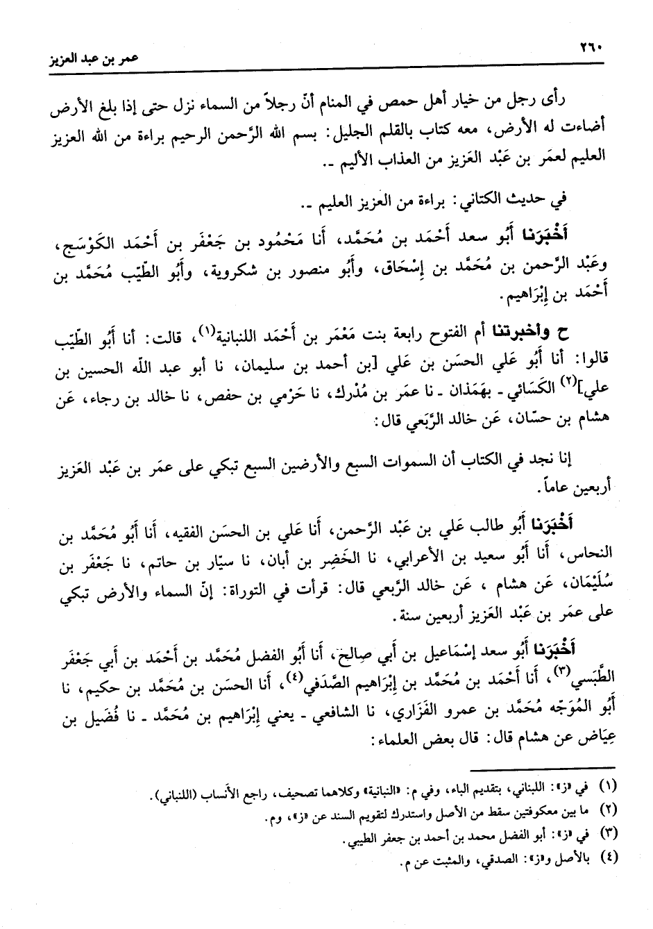رأى رجل من خيار أهل حمص في المنام أن رجلا من السماء نزل حتى إذا بلغ الأرض أضاءت له الأرض معه كتاب بالقلم الجليل بسم الله الرحمن الرحيم براءة من الله العزيز العليم لعمر بن عبد العزيز من العذاب الأليم في حديث الكتاني براءة من العزيز العليم أخبرنا أبو سعد أحمد بن محمد أنا محمود بن جعفر بن أحمد الكوسج وعبد الرحمن بن محمد بن إسحاق وأبو منصور بن شكروية وأبو الطيب محمد بن أحمد بن إبراهيم ح وأخبرتنا أم الفتوح رابعة بنت معمر بن أحمد اللنبانية قالت أنا أبو الطيب قالوا أنا أبو علي الحسن بن علي بن أحمد بن سليمان نا أبو عبد الله الحسين بن علي (2) الكسائي بهمذان نا عمر بن مدرك نا حرمي بن حفص نا خالد بن رجاء عن هشام بن حسان عن خالد الربعي قال إنا نجد في الكتاب أن السموات السبع والأرضين السبع تبكي على عمر بن عبد العزيز أربعين عاما أخبرنا أبو طالب علي بن عبد الرحمن أنا علي بن الحسن الفقيه أنا أبو محمد بن النحاس أنا أبو سعيد بن الأعرابي نا الخضر بن أبان نا سيار بن حاتم نا جعفر بن سليمان عن هشام عن خالد الربعي قال قرأت في التوراة إن السماء والأرض تبكي على عمر بن عبد العزيز أربعين سنة أخبرنا أبو سعد إسماعيل بن أبي صالح أنا أبو الفضل محمد بن أحمد بن أبي جعفر الطبسي (3) أنا أحمد بن محمد بن إبراهيم الصدفي (4) أنا الحسين بن محمد بن حكيم نا أبو الموجه محبن عمرو الفزاري نا الشافعي يعني إبراهيم بن محمد نا فضيل بن عياض عن هشام قال قال بعض العلماء