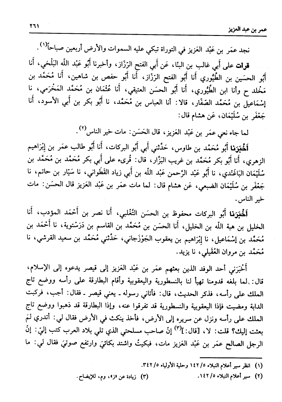 نجد عمر بن عبد العزيز في التوراة تبكي عليه السموات والأرض أربعين صباحا (1) قرأت على أبي غالب بن البنا عن أبي الفتح الرزاز وأخبرنا أبو عبد الله البلخي أنا أبو الحسين بن الطيوري أنا أبو الفتح الرزاز أنا أبو حفص بن شاهين أنا محمد بن مخلد وأنا ابن الطيوري أنا أبو الحسن العتيقي أنا عثمان بن محمد المخرمي نا إسماعيل بن محمد الصفار قالا أنا العباس بن محمد نا أبو بكر بن أبي الأسود أنا جعفر بن سليمان عن هشام قال لما جاء نعي عمر بن عبد العزيز قال الحسن مات خير الناس (2) أخبرنا أبو محمد بن طاوس حدثني أبي أبو البركات أنا أبو طالب عمر بن إبراهيم الزهري أنا أبو بكر محمد بن غريب البزار قال قرئ على أبي بكر محمد بن محمد بن سليمان الباغندي نا أبو عبد الرحمن عبد الله بن أبي زياد القطواني نا سيار بن حاتم نا جعفر بن سليمان الضبعي عن هشام قال لما مات عمر بن عبد العزيز قال الحسن مات خير الناس أخبرنا أبو البركات محفوظ بن الحسن التغلبي أنا نصر بن أحمد المؤدب أنا الخليل بن هبة الله بن الخليل أنا الحسن بن محمد بن القاسم بن درستوية نا أحمد بن محمد بن إسماعيل نا إبراهيم بن يعقوب الجوزجاني حدثني محمد بن سعيد القرشي نا محمد بن مروان العقيلي نا يزيد أخبرني أحد الوفد الذين بعثهم عمر بن عبد العزيز إلى قيصر يدعوه إلى الإسلام قال لما بلغه قدومنا تهيأ لنا بالنسطورية واليعقوبية وأقام البطارقة على رأسه ووضع تاج الملك على رأسه فذكر الحديث قال فأتاني رسوله يعني قيصر فقال أجب فركبت الدابة ومضيت فإذا اليعقوبية والنسطورية قد تفرقوا عنه وإذا البطارقة قد ذهبوا ووضع تاج الملك على رأسه ونزل عن سريره إلى الأرض فأخذ ينكث في الأرض فقال لي أتدري لم بعثت إليك قلت لا قال (3) إن صاحب مسلحتي الذي تلي بلاد العرب كتب إلي إن الرجل الصالح عمر بن عبد العزيز مات فبكيت واشتد بكائي وارتفع صوتي فقال لي ما