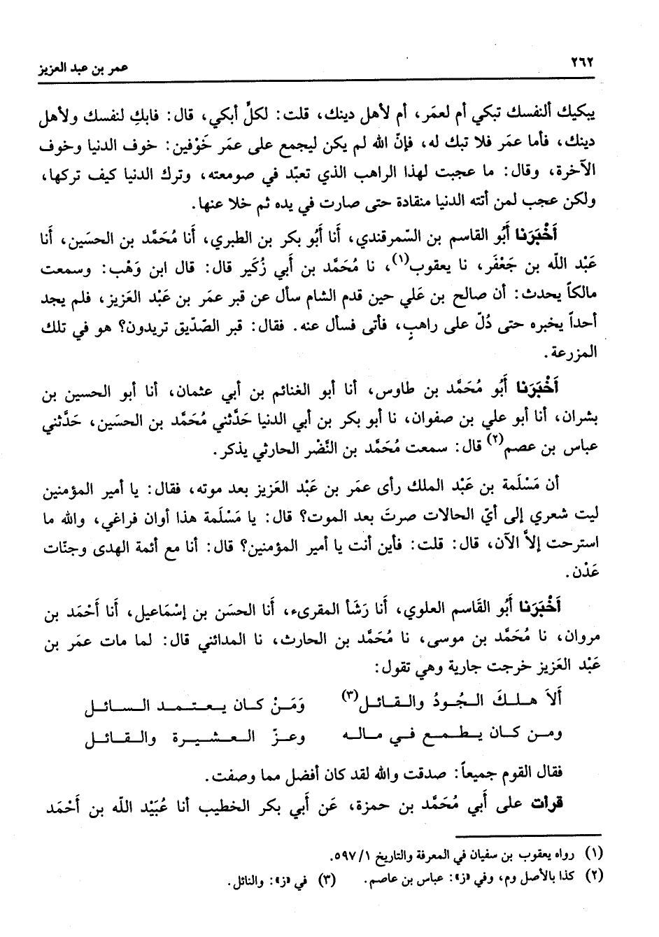 يبكيك ألنفسك تبكي العمر أم لأهل دينك قلت لكل أبكى قال فابك لنفسك ولأهل دينك فأما عمر فتبك له فإن الله لم يكن ليجمع على عمر خوفين خوف الدنيا وخوف الآخرة وقال ما عجبت لهذا الراهب الذي تعبد في صومعته وترك الدنيا كيف تركها ولكن عجب لمن أتته الدنيا منقادة حتى صارت في يده ثم خلا عنها أخبرنا أبو القاسم بن السمرقندي أنا أبو بكر بن الطبري أنا محمد بن الحسين أنا عبد الله بن جعفر نا يعقوب (1) نا محمد بن أبي زكير قال قال ابن وهب وسمعت مالكا يحدث أن صالح بن علي حين قدم الشام سأل عن قبر عمر بن عبد العزيز فلم يجد أحدا يخبره حتى دل على راهب فأتى فسأل عنه فقال قبر الصديق تريدون هو في تلك المزرعة أخبرنا أبو محمد بن طاوس أنا أبو الغنائم بن أبي عثمان أنا أبو الحسين بن بشران أنا أبو علي بن صفوان نا أبو بكر بن أبي الدنيا حدثني محمد بن الحسين حدثني عباس بن عصم (2) قال سمعت محمد بن النضر الحارثي يذكر أن مسلمة بن عبد الملك رأى عمر بن عبد العزيز بعد موته فقال يا أمير المؤمنين ليت شعري إلى أي الحالات صرت بعد الموت قال يا مسلمة هذا أوان فراغي والله ما استرحت إلا الآن قال قلت فأين أنت يا أمير المؤمنين قال أنا مع أئمة الهدى وجنات عدن أخبرنا أبو القاسم العلوي أنا رشأ المقرئ أنا الحسن بن إسماعيل أنا أحمد بن مروان نا محمد بن موسى نا محمد بن الحارث نا المدائني قال لما مات عمر بن عبد العزيز خرجت جارية وهي تقول * ألا هلك الجود والقائل (3) * ومن كان يعتمد السائل ومن كان يطمع في ماله وعز العشيرة والقائل * فقال القوم جميعا صدقت والله لقد كان أفضل مما وصفت قرأت على أبي محمد بن حمزة عن أبي بكر الخطيب أنا عبيد الله بن أحمد