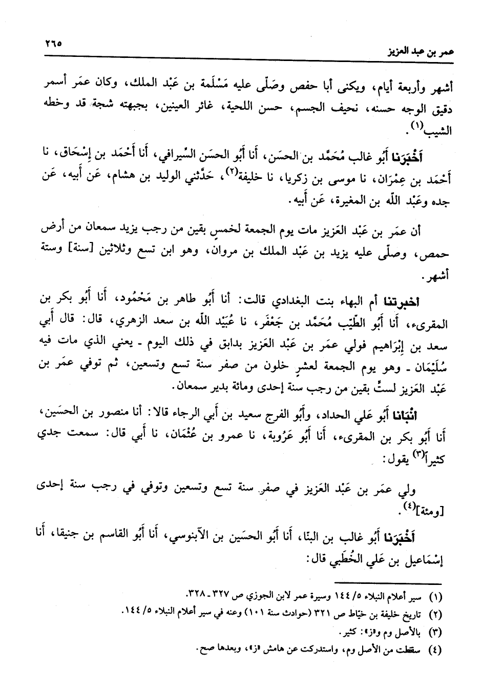 أشهر وأربعة أيا ويكنى أبا حفص وصلى عليه مسلمة بن عبد الملك وكان عمر أسمر دقيق الوجه حسنه نحيف الجسم حسن اللحية غائر العينين بجبهته شجة قد وخطه الشيب (1) أخبرنا أبو غالب محمد بن الحسن أنا أبو الحسن السيرافي أنا أحمد بن إسحاق نا أحمد بن عمران نا موسى بن زكريا نا خليفة حدثني الوليد بن هشام عن أبيه عن جده وعبد الله بن المغيرة عن أبيه أن عمر بن عبد العزيز مات يوم الجمعة لخمس بقين من رجب يزيد سمعان من أرض حمص وصلى عليه يزيد بن عبد الملك بن مروان وهو ابن تسع وثلاثين سنة وستة أشهر أخبرتنا أم البهاء بنت البغدادي قالت أنا أبو طاهر بن محمود أنا أبو بكر بن المقرئ أنا أبو الطيب محمد بن جعفر نا عبيد الله بن سعد الزهري قال قال أبي سعد بن إبراهيم فولي عمر بن عبد العزيز بدابق في ذلك اليوم يعني الذي مات فيه سليمان وهو يوم الجمعة لعشر خلون من صفر سنة تسع وتسعين ثم توفي عمر بن عبد العزيز لست بقين من رجب سنة إحدى ومائة بدير سمعان أنبأنا أبو علي الحداد وأبو الفرج سعيد بن أبي رالرجاء قالا أنا منصور بن الحسين أنا أبو بكر بن المقرئ أنا أبو عروبة نا عمرو بن عثمان نا أبي قال سمعت جدي كثيرا (3) يقول ولي عمر بن عبد العزيز في صفر سنة تسع وتسعين وتوفي في رجب سنة إحدى ومئة (4) أخبرنا أبو غالب بن البنا أنا أبو الحسين بن الآبنوسي أنا أبو القاسم بن جنيقا أنا إسماعيل بن علي الخطبي قال