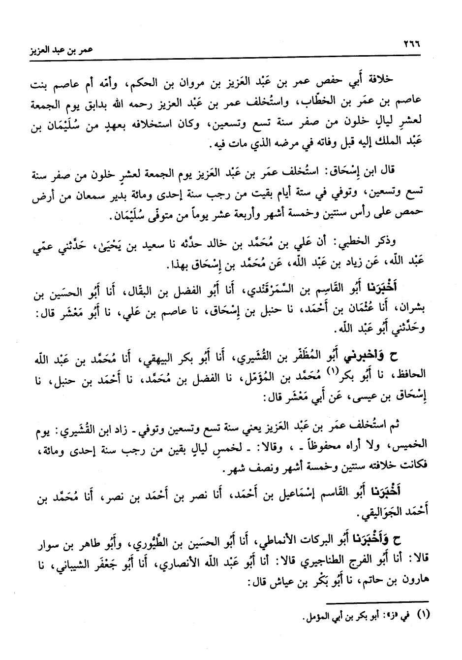 خلافة أبي حفص عمر بن عبد العزيز بن مروان بن الحكم وأمه أم عاصم بنت عاصم بن عمر بن الخطاب واستخلف عمر بن عبد العزيز رحمه الله بدابق يوم الجمعة لعشر ليال خلون من صفر سنة تسع وتسعين وكان استخلافه بعهد من سليمان بن عبد الملك إليه قبل وفاته في مرضه الذي مات فيه قال ابن إسحاق استخلف عمر بن عبد العزيز يوم الجمعة لعشر خلون من صفر سنة تسع وتسعين وتوفي في ستة أيام بقيت من رجب سنة إحدى ومائة بدير سمعان من أرض حمص على رأس سنتين وخمسة أشهر وأربعة عشرة يوما من متوفى سليمان وذكر الخطبي أن علي بن محمد بن خالد حدثه نا سعيد بن يحيى حدثني عمي عبد الله عن زياد بن عبد الله عن محمد بن إسحاق بهذا أخبرنا أبو القاسم بن السمرقندي أنا أبو الفضل بن البقال أنا أبو الحسين بن بشران أنا عثمان بن أحمد نا حنبل بن إسحاق نا عاصم بن علي نا أبو معشر قال وحدثني أبو عبد الله ح وأخبرني أبو المظفر بن القشيري أنا أبو بكر البيهقي أنا محمد بن عبد الله الحافظ نا أبو بكر (1) محمد بن المؤمل نا الفضل بن محمد نا أحمد بن حنبل نا إسحاق بن عيسى عن أبي معشر قال ثم استخلف عمر بن عبد العزيز يعني سنة تسع وتسعين وتوفي زاد ابن القشيري يوم الخميس ولا أراه محفوظا وقالا لخمس ليال بقين من رجب سنة إحدى ومائة فكانت خلافته سنتين وخمسة أشهر ونصف شهر أخبرنا أبو القاسم إسماعيل بن أحمد أنا نصر بن أحمد بن نصر أنا محمد بن أحمد الجواليقي ح وأخبرنا أبو البركات الأنماطي أنا أبو الحسين بن الطيوري وأبو طاهر بن سوار قالا أنا أبو الفرج الطناجيري قالا أنا أبو عبد الله الأنصاري أنا أبو جعفر الشيباني نا هارون بن حاتم نا أبو بكر بن عياش قال