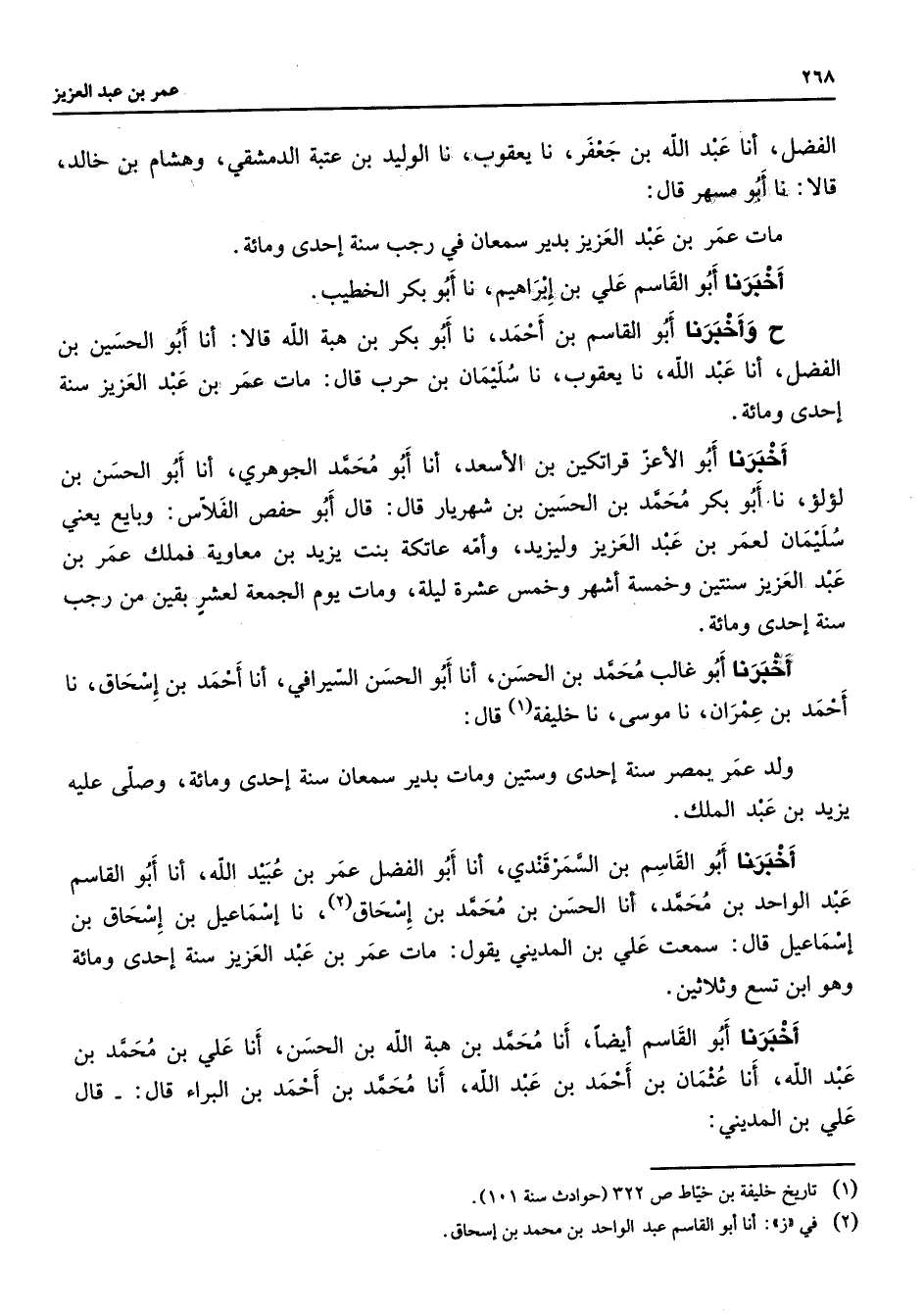 الفضل أنا عبد الله بن جعفر نا يعقوب نا الوليد بن عتبة الدمشقي وهشام بن خالد قالا نا أبو مسهر قال مات عمر بن عبد العزيز بدير سمعان في رجب سنة إحدى ومائة أخبرنا أبو القاسم علي بن إبراهيم نا أبو بكر الخطيب ح وأخبرنا أبو القاسم بن أحمد نا أبو بكر بن هبة الله قالا أنا أبو الحسين بن الفضل أنا عبد الله نا يعقوب نا سليمان بن حرب قال مات عمر بن عبد العزيز سنة إحدى ومائة أخبرنا أبو الأعز قراتكين بن الأسعد أنا أبو محمد الجوهري أنا أبو الحسن بن لؤلؤ نا أبو بكر محمد بن الحسين بن شهريار قال قال أبو حفص الفلاس وبايع يعني سليمان لعمر بن عبد العزيز وليزيد وأمه عاتكة بنت يزيد بن معاوية فملك عمر بن عبد العزيز سنتين وخمسة أشهر وخمس عشرة ليلة ومات يوم الجمعة لعشر بقين من رجب سنة إحدى ومائة أخبرنا أبو غالب محمد بن الحسن أنا أبو الحسن السيرافي أنا أحمد بن إسحاق نا أحمد بن عمران نا موسى نا خليفة (1) قال ولد عمر بمصر سنة إحدى وستين ومات بدير سمعان سنة إحدى ومائة وصلى عليه يزيد بن عبد الملك أخبرنا أبو القاسم بن السمرقندي أنا أبو الفضل عمر بن عبيد الله أنا أبو القاسم عبد الواحد بن محمد أنا الحسن بن محمد بن إسحاق (2) نا إسماعيل بن إسحاق بن إسماعيل قال سمعت علي بن المديني يقول مات عمر بن عبد العزيز سنة إحدى ومائة وهو ابن تسع وثلاثين أخبرنا أبو القاسم أيضا أنا محمد بن هبة الله بن الحسن أنا علي بن محمد بن عبد الله أنا عثمان بن أحمد بن عبد الله أنا محمد بن أحمد بن البراء قال قال علي بن المديني