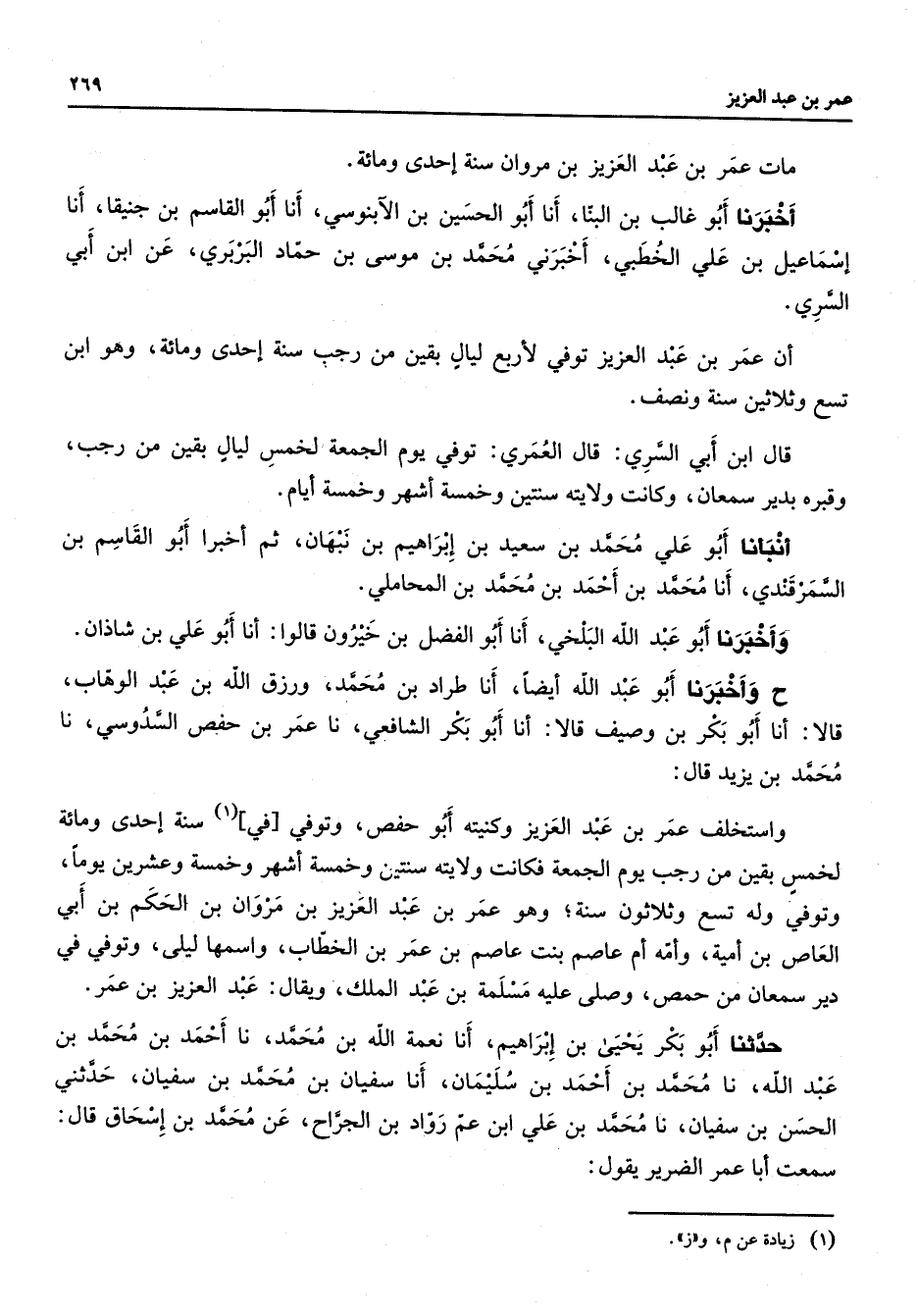 مات عمر بن عبد العزيز بن مروان سنة إحدى ومائة أخبرنا أبو غالب بن البنا أنا أبو الحسين بن الآبنوسي أنا أبو القاسم بن جنيقا أنا إسماعيل بن علي الخطبي أخبرني محمد بن موسى بن حماد البربري عن ابن أبي السري أن عمر بن عبد العزيز توفي لأربع ليال بقين من رجب سنة إحدى ومائة وهو ابن تسع وثلاثين سنة ونصف قال ابن أبي السري قال العمري توفي يوم الجمعة لخمس ليال بقين من رجب وقبره بدير سمعان وكانت ولايته سنتين وخمسة أشهر وخمسة أيام أنبأنا أبو علي محمد بن سعيد بن إبراهيم بن نبهان ثم أخبرا أبو القاسم بن السمرقندي أنا محمد بن أحمد بن محمد بن المحاملي وأخبرنا أبو عبد الله البلخي أنا أبو الفضل بن خيرون قالوا أنا أبو علي بن شاذان ح وأخبرنا أبو عبد الله أيضا أنا طراد بن محمد ورزق الله بن عبد الوهاب قالا أنا أبو بكر بن وصيف قالا أنا أبو بكر الشافعي نا عمر بن حفص السدوسي نا محمد بن يزيد قال واستخلف عمر بن عبد العزيز وكنيته أبو حفص وتوفي في سنة إحدى ومائة لخمس بقين من رجب يوم الجمعة فكانت ولايته سنتين وخمسة أشهر وخمسة وعشرين يوما وتوفي وله تسع وثلاثون سنة وهو عمر بن عبد العزيز بن مروان بن الحكم بن أبي العاص بن أمية وأمه أم عاصم بنت عاصم بن عمر بن الخطاب واسمها ليلى وتوفي في دير سمعان من حمص وصلى عليه مسلمة بن عبد الملك ويقال عبد العزيز بن عمر حدثنا أبو بكر يحيى بن إبراهيم أنا نعمة الله بن محمد نا أحمد بن محمد بن عبد الله نا محمد بن أحمد بن سليمان أنا سفيان بن محمد بن سفيان حدثني الحسن بن سفيان نا محمد بن علي ابن عم رواد بن الجراح عن محمد بن إسحاق قال سمعت أبا عمر الضرير يقول