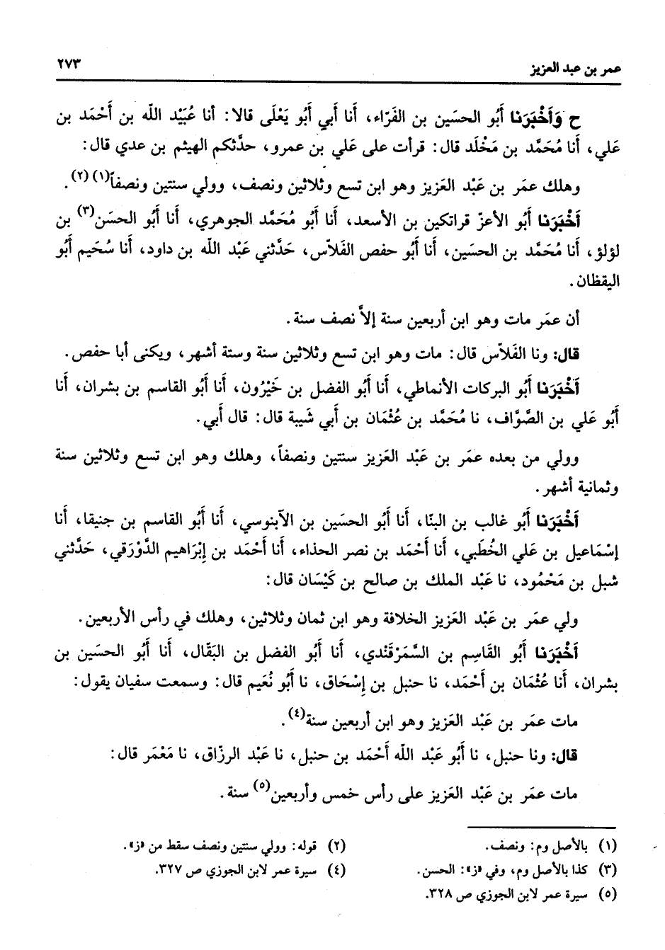 ح وأخبرنا أبو الحسين بن الفراء أنا أبي أبو يعلى قالا أنا عبيد الله بن أحمد بن علي أنا محمد بن مخلد قال قرأت على علي بن عمرو حدثكم الهيثم بن عدي قال وهلك عمر بن عبد العزيز وهو ابن تسع وثلاثين ونصف وولي سنتين ونصفا (1) (2) أخبرنا أبو الأعز قراتكين بن الأسعد أنا أبو محمد الجوهري أنا أبو الحسن (3) بن لؤلؤ أنا محمد بن الحسين أنا أبو حفص الفلاس حدثني عبد الله بن داود أنا سحيم أبو اليقظان أن عمر مات وهو ابن أربعين سنة إلا نصف سنة قال ونا الفلاس قال مات وهو ابن تسع وثلاثين سنة وستة أشهر ويكنى أبا حفص أخبرنا أبو البركات الأنماطي أنا أبو الفضل بن خيرون أنا أبو القاسم بن بشران أنا أبو علي بن الصواف نا محمد بن عثمان بن أبي شيبة قال قال أبي وولي من بعده عمر بن عبد العزيز سنتين ونصفا وهلك وهو ابن تسع وثلاثين سنة وثمانية أشهر أخبرنا أبو غالب بن البنا أنا أبو الحسين بن الآبنوسي أنا أبو القاسم بن جنيقا أنا إسماعيل بن علي الخطبي أنا أحمد بن نصر الحذاء أنا أحمد بن إبراهيم الدورقي حدثني شبل بن محمود نا عبد الملك بن صالح بن كيسان قال ولي عمر بن عبد العزيز الخلافة وهو ابن ثمان وثلاثين وهلك في رأس الأربعين أخبرنا أبو القاسم بن السمرقندي أنا أبو الفضل بن البقال أنا أبو الحسين بن بشران أنا عثمان بن أحمد نا حنبل بن إسحاق نا أبو نعيم قال وسمعت سفيان يقول مات عمر بن عبد العزيز وهو ابن أربعين سنة (4) قال ونا حنبل نا أبو عبد الله أحمد بن حنبل نا عبد الرزاق نا معمر قال مات عمر بن عبد العزيز على رأس خمس وأربعين (5) سنة