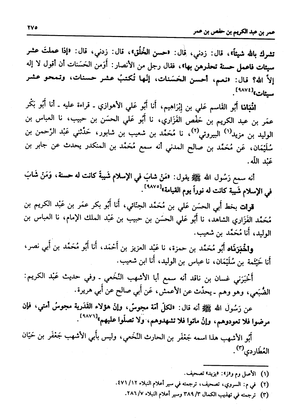 تشرك بالله شيئا قال زدني قال حسن الخلق قال زدني قال إذا عملت عشر سيئات فاعمل حسنة تحذرهن بها فقال رجل من الأنصار أو من الحسنات أن أقول لا إله إلا الله قال نعم أحسن الحسنات إنها تكتب عشر حسنات وتمحو عشر سيئات أنبأنا أبو القاسم علي بن إبراهيم أنا أبو علي الأهوازي قراءة عليه أنا أبو بكر عمر بن عبد الكريم بن حفص الفزاري نا أبو علي الحسن بن حبيب نا العباس بن الوليد بن مزيد (1) البيروتي (2) نا محمد بن شعيب بن شابور حدثني عبد الرحمن بن سليمان عن محمد بن صالح المدني أنه سمع محمد بن المنكدر يحدث عن جابر بن عبد الله أنه سمع رسول الله (صلى الله عليه وسلم) يقول من شاب في الإسلام شيبة كانت له حسنة ومن شاب في الإسلام شيبة كانت له نورا يوم القيامة قرأت بخط أبي الحسن علي بن محمد الحنائي أنا أبو بكر عمر بن عبد الكريم بن محمد الفزاري الشاهد نا أبو علي الحسن بن حبيب بن عبد الملك الإمام نا العباس بن الوليد أنا محمد بن شعيب وأخبرناه أبو محمد بن حمزة نا عبد العزيز بن أحمد أنا أبو محمد بن أبي نصر أنا خيثمة بن سليمان نا عباس بن الوليد أنا ابن شعيب أخبرني غسان بن ناقد أنه سمع أبا الأشهب النخعي وفي حديث عبد الكريم الضبعي وهو وهم يحدث عن الأعمش عن أبي صالح عن أبي هريرة عن رسول الله (صلى الله عليه وسلم) أنه قال لكل أمة مجوس وإن هؤلاء القدرية مجوس أمتي فإن مرضوا فلا تعودوهم وإن ماتوا فلا تشهدوهم ولا تصلوا عليهم أبو الأشهب هذا اسمه جعفر بن الحارث النخعي وليس بأبي الأشهب جعفر بن حيان العطاردي (3)