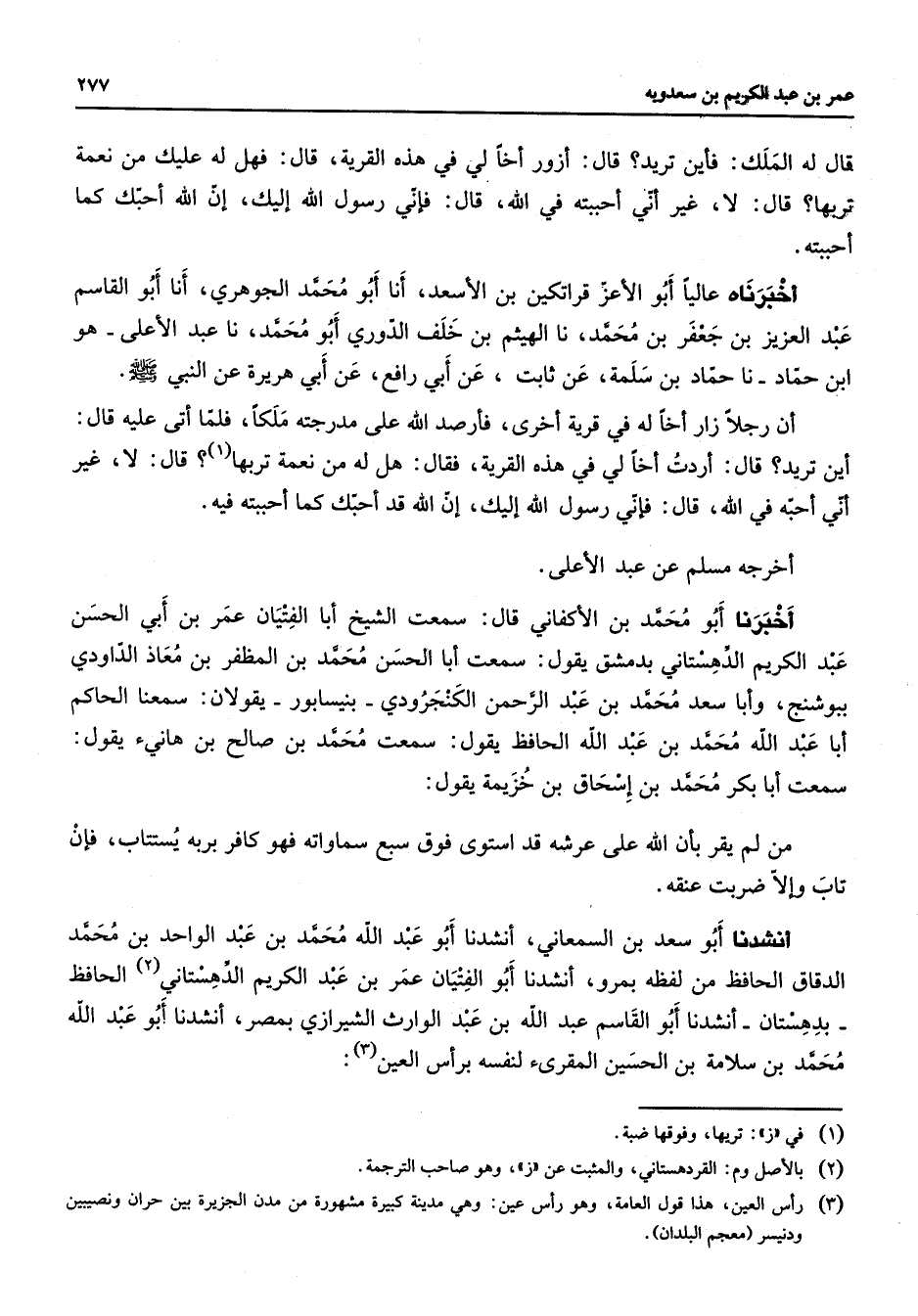 قال له الملك فأين تريد قال أزور أخا لي في هذه القرية قال فهل له عليك من نعم تربها قال لا غير أني أحببته في الله قال فإني رسول الله إليك إن الله أحبك كما أحببته أخبرناه عاليا أبو الأعز قراتكين بن الأسعد أنا أبو محمد الجوهري أنا أبو القاسم عبد العزيز بن جعفر بن محمد بن اليهثم بن خلف الدوري أبو محمد نا عبد الأعلى هو ابن حماد نا حماد بن سلمة عن ثابت عن أبي رافع عن أبي هريرة عن النبي (صلى الله عليه وسلم) أن رجلا زار أخا له في قرية أخرى فأرصد الله على مدرجته ملكا فلما أتى عليه قال أين تريد قال أردت أخا لي في هذه القرية فقال هل له من نعمة تربها قال لا غير أني أحبه في الله قال فإني رسول الله إليك إن الله قد أحبك كما أحببته فيه أخرجه مسلم عن عبد الأعلى أخبرنا أبو محمد بن الأكفاني قال سمعت الشيخ أبا الفتيان عمر بن أبي الحسن عبد الكريم الدهستاني بدمشق يقول سمعت أبا الحسن محمد بن المظفر بن معاذ الداودي ببوشنج وأبا سعد محمد بن عبد الرحمن الكنجرودي بنيسابور يقولان سمعنا الحاكم أبا عبد الله محمد بن عبد الله الحافظ يقول سمعت محمد بن صالح بن هانئ يقول سمعت أبا بكر محمد بن إسحاق بن خزيمة يقول من لم يقر أن الله على عرشه قد استوى فوق سبع سماواته فهو كافر بربه يستتاب فإن تاب وإلا ضربت عنقه أنشدنا أبو سعد بن السمعاني أنشدنا أبو عبد الله محمد بن عبد الواحد بن محمد الدقاق الحافظ من لفظه بمرو أنشدنا أبو الفتيان عمر بن عبد الكريم الدهستاني (2) الحافظ بدهستان أنشدنا أبو القاسم عبد الله بن عبد الوارث الشيرازي بمصر أنشدنا أبو عبد الله محمد بن سلامة بن الحسين المقرئ لنفسه برأس العين (3)